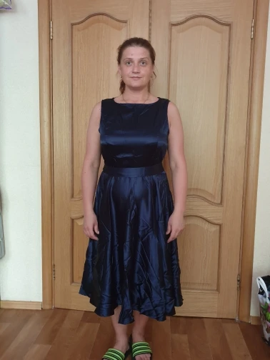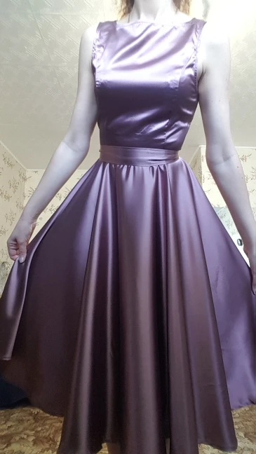 Beautiful fabric, neatly sewn, the figure sits well. The skirt is sunny. Included belt but can be worn without it. On the back of the tucks and the lock.