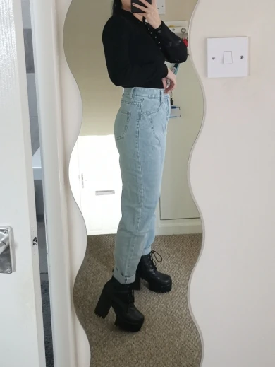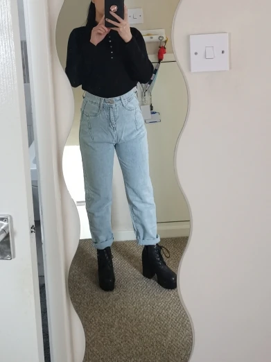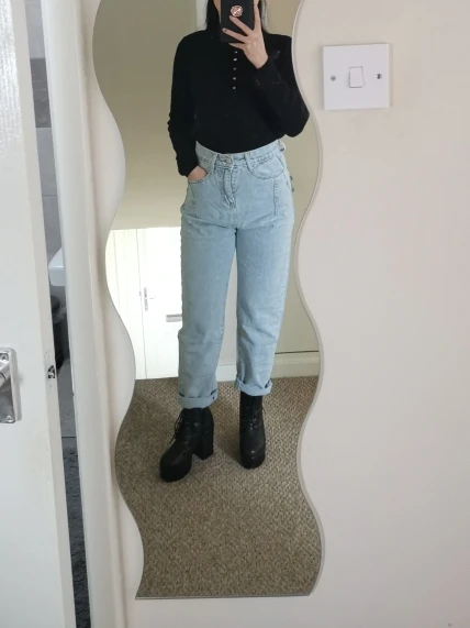 Good quality jeans and looks like the ones in the photos. I am 153cm (5ft) in height and usually wear UK Size 6-8 pants, I ordered size S and these fit really snugly and when buttoned up, the waist area is really tight. They are proper jeans material and not stretchy at all unlike jeggings etc. so would recommend measuring out your size properly