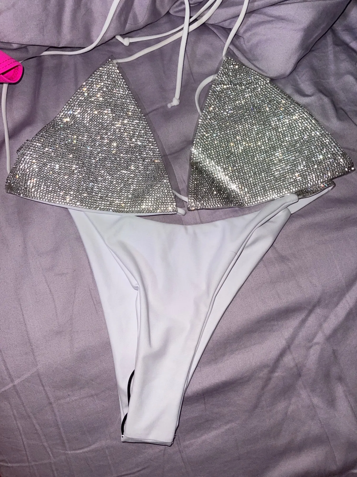 Women’s Luxury Bling Rhinestone Silver Bikini Sexy Low Waist Brazilian Style Thong and Cropped Tank Top  Bikini. Sexy and Stylish.