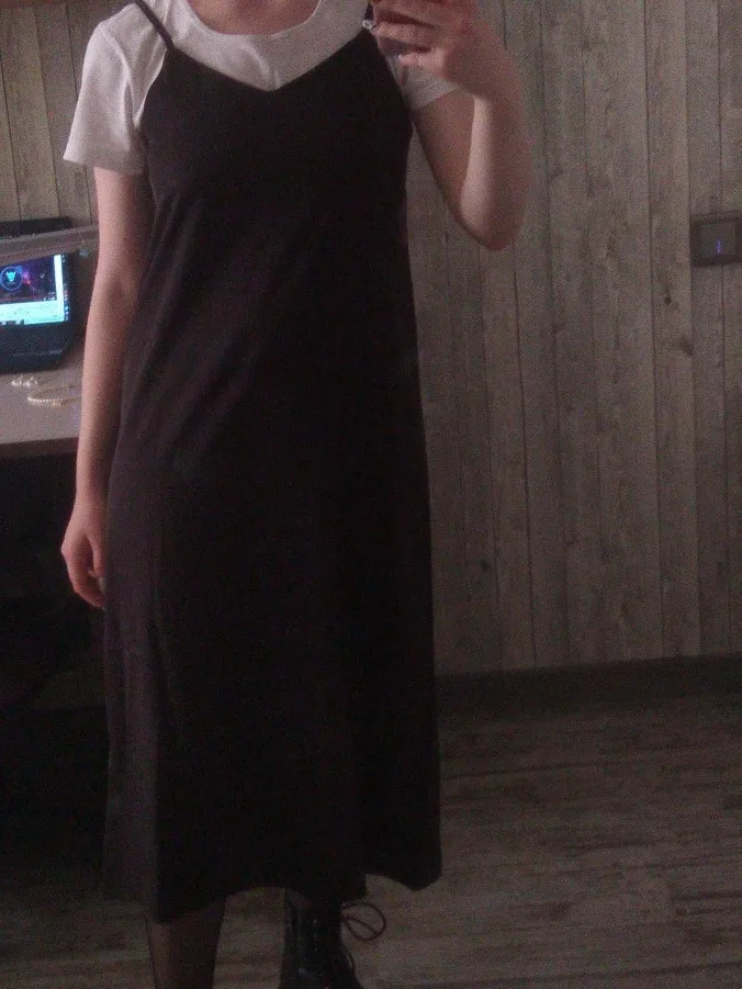 Excellent dress, the size 42-44 is a little too big, from below is not critical, especially noticeable in the chest area, I think more on the chest will be just right. The material is dense, pleasant. Corresponds to the description, I recommend the goods and the store.