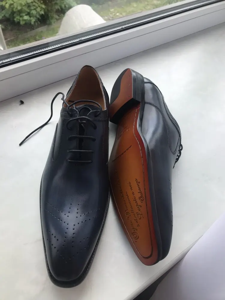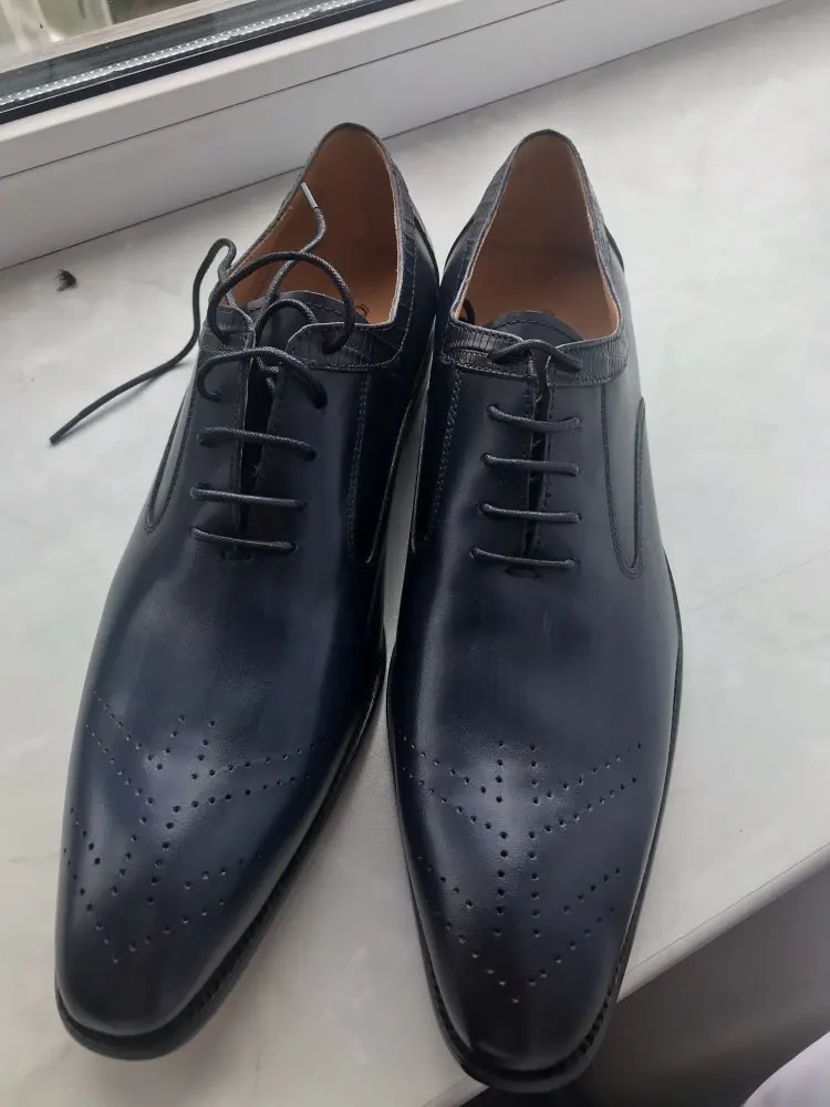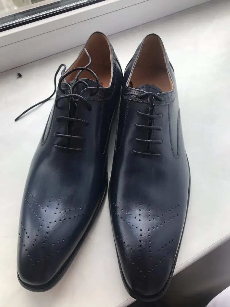 Product Description High-Quality Oxford Shoes Colour: Dark-blue, Black Style: Hand-Painted Men's Oxford Shoes Upper Material: Cow Leather Lining Material: Sheepskin Insole Material: PU Outsole Material: Rubber Heel: 2.6 cm Wide of sole: 10-10.2 cm Size: EU Size 39-46 Quality: High Grade Highlight: Exquisite workmanship & stitching thread and Comfortable Shoe images