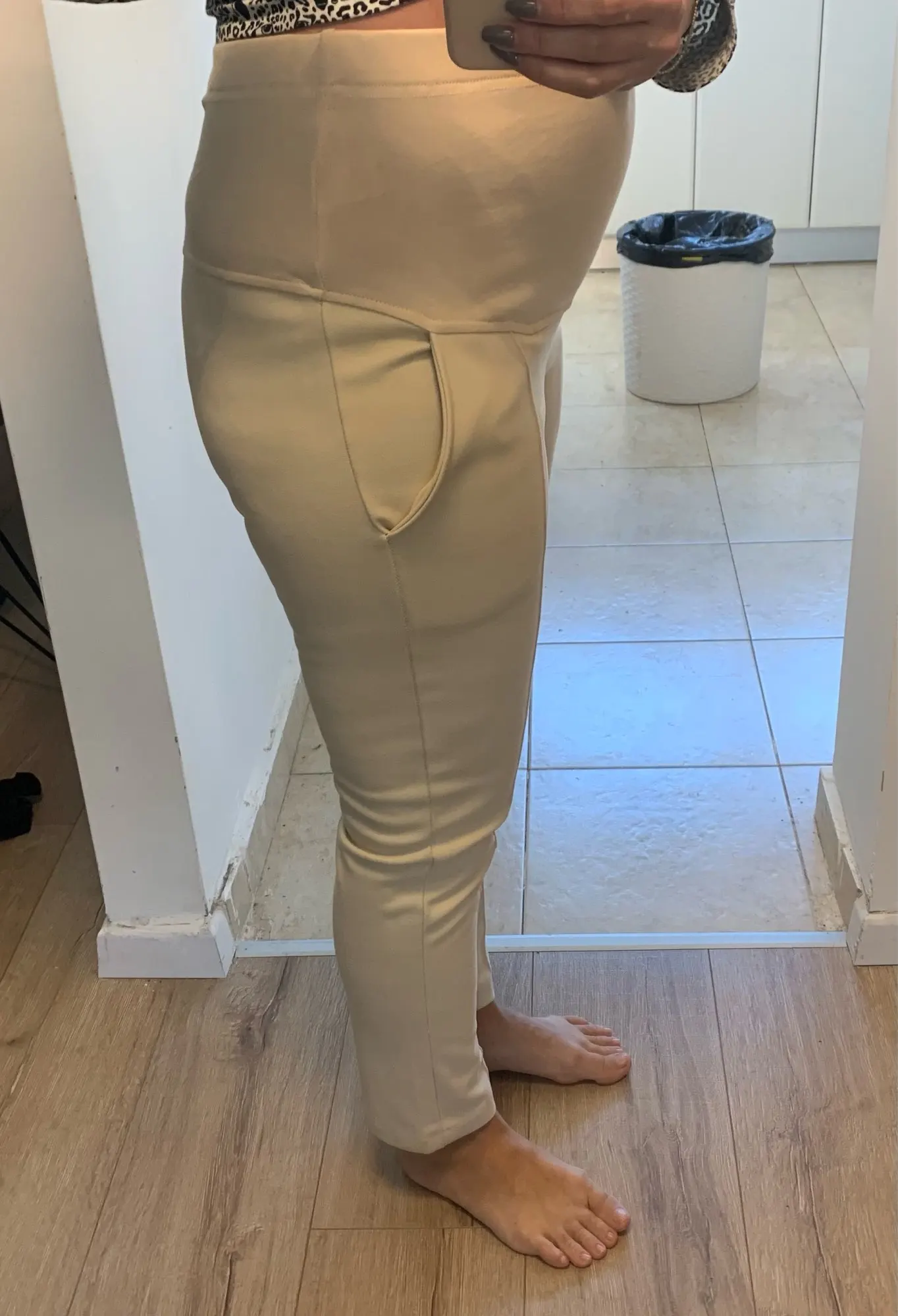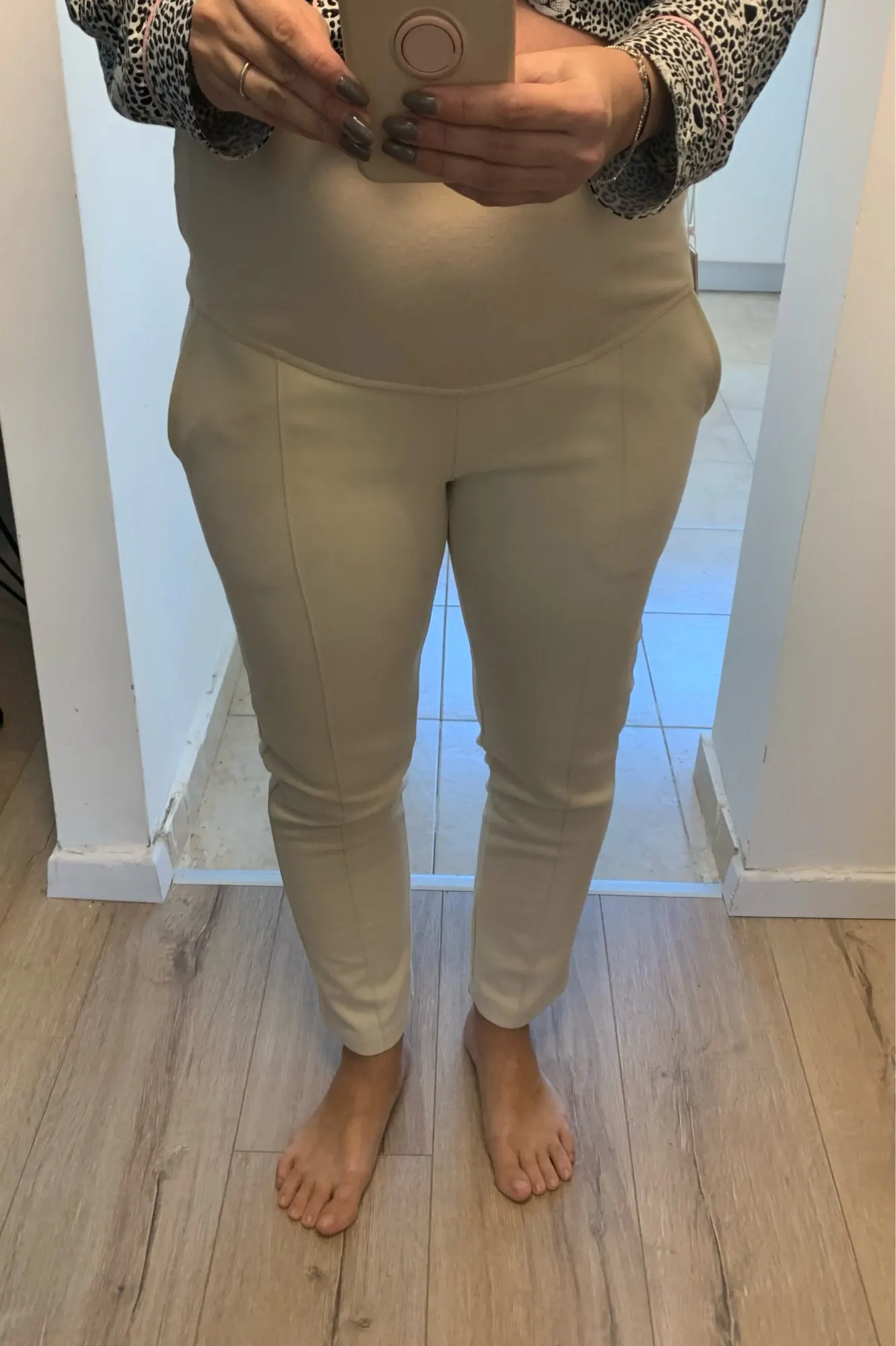 I have a period of 14 weeks, the stomach has just begun to grow. But all the pants are already tight, so I decided to buy pants. In the photo, the models also have small types of tummy. First opened and they seemed huge, dressed-on the hips well, a little with a margin, the bag for the abdomen is huge and it seemed that it starts low .. to the touch sooo pleasant, tight .. i think well, I'll leave .. for the future, In the last months I'll at least .. the truth of the gum did not find any and I think it will be necessary to sew... and then looked in reviews from other customers and thanks to them I saw that there is a tank on the side, which is stretched, attached to the button and veil and my stomach is just under the pants. Cool decision!