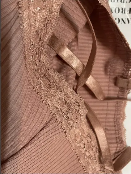 Fast shipping, color and design are the same as description photo. The fabric is pretty elastic, I ordered an L but I usually use a XL or bigger because my chest is 120, however this one fits perfectly. The only bad thing is that being the elastic fabric but the lace don't break the seams, I had to give the whole lace a stitch to make sure it didn't break again and for the time being I 've had no problem.