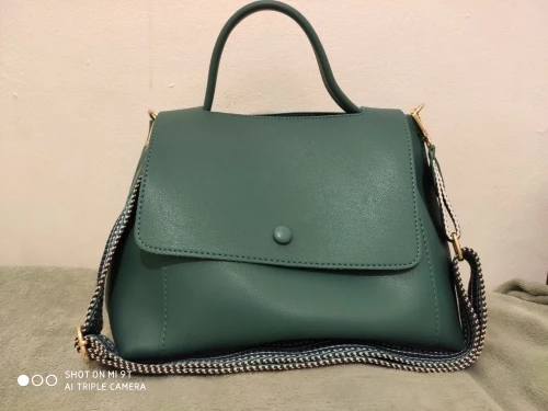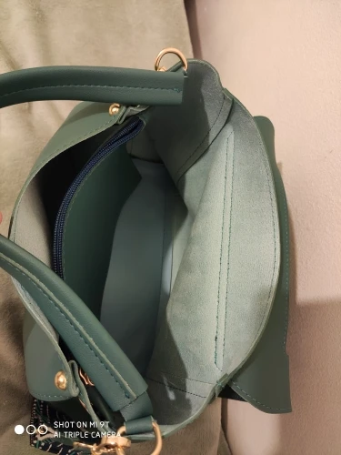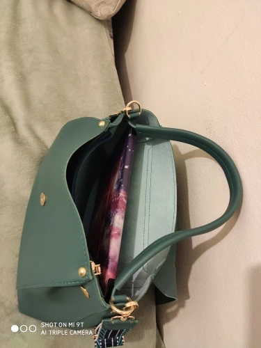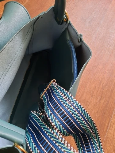 The bag is very cool!!! The color is amazing. Something between blue and green. Worried that the color will be green as on a traffic light. But no. Large bag, photo with a tablet for size. Beautiful woven strap. Inside there is a pocket on the lock. Although I would add a couple more internal cows