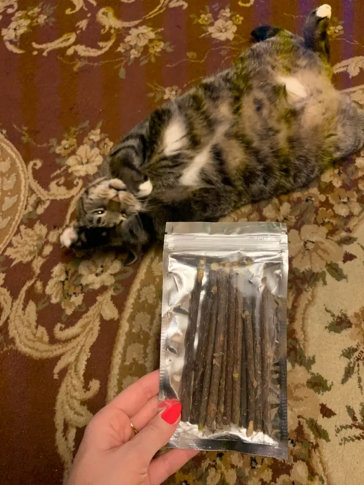 Ordered 12.10, received 15.11, threw in the mailbox. Cat liked sticks, played with them and gnawed. Gave the old cat mother, he rubbed about it and behaved strangely)