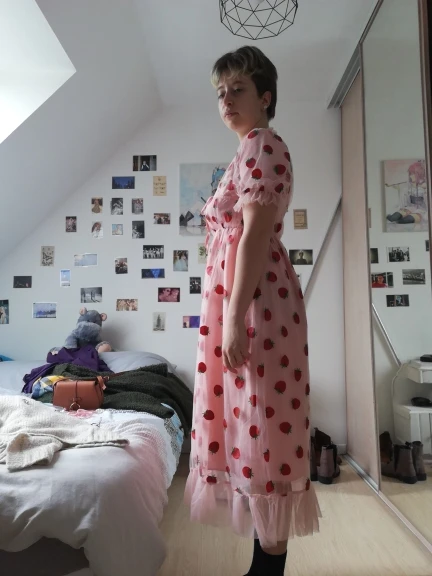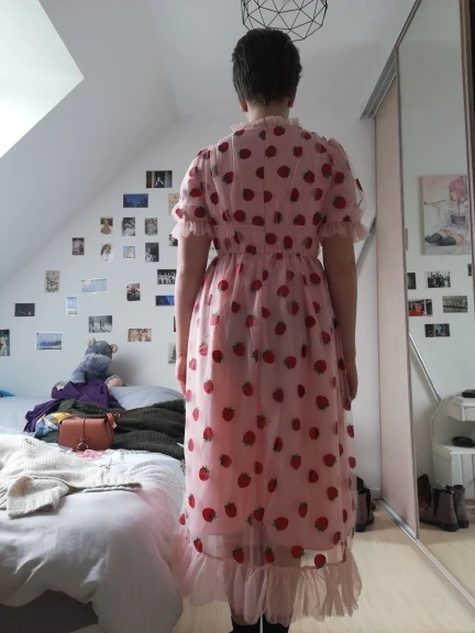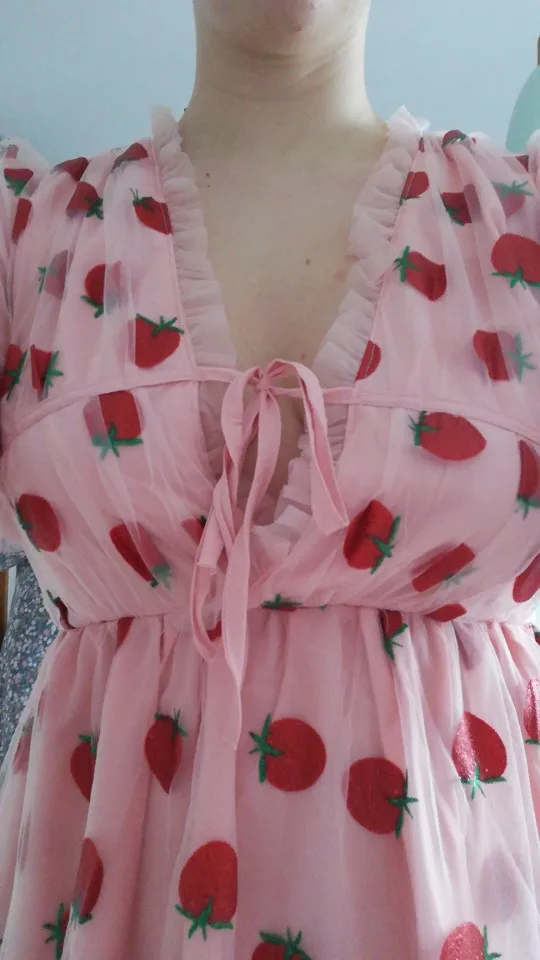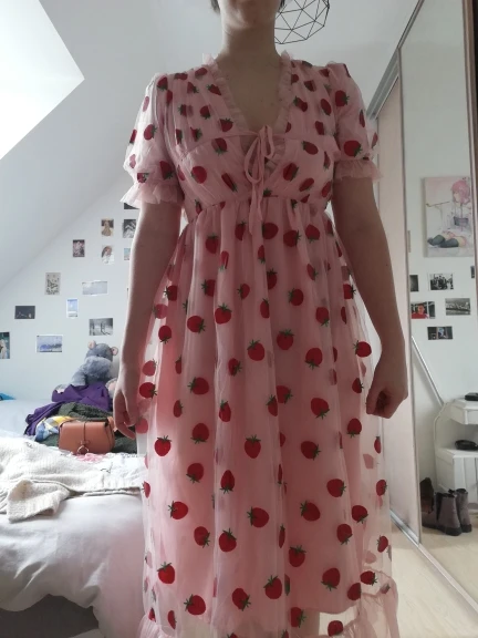 Product is just like in the pictures, it's just perfect. Material seems to be high quality, strawberries on dress are nice and shiny. Came faster than expected - estimated date was May 28th, and it came to me May 10th! Fits me perfectly. I asked store for advice, and the size that was suggested is perfect! For measurments 86/66/97 and 177 cm I choosed M. Totally would recommend to everyone