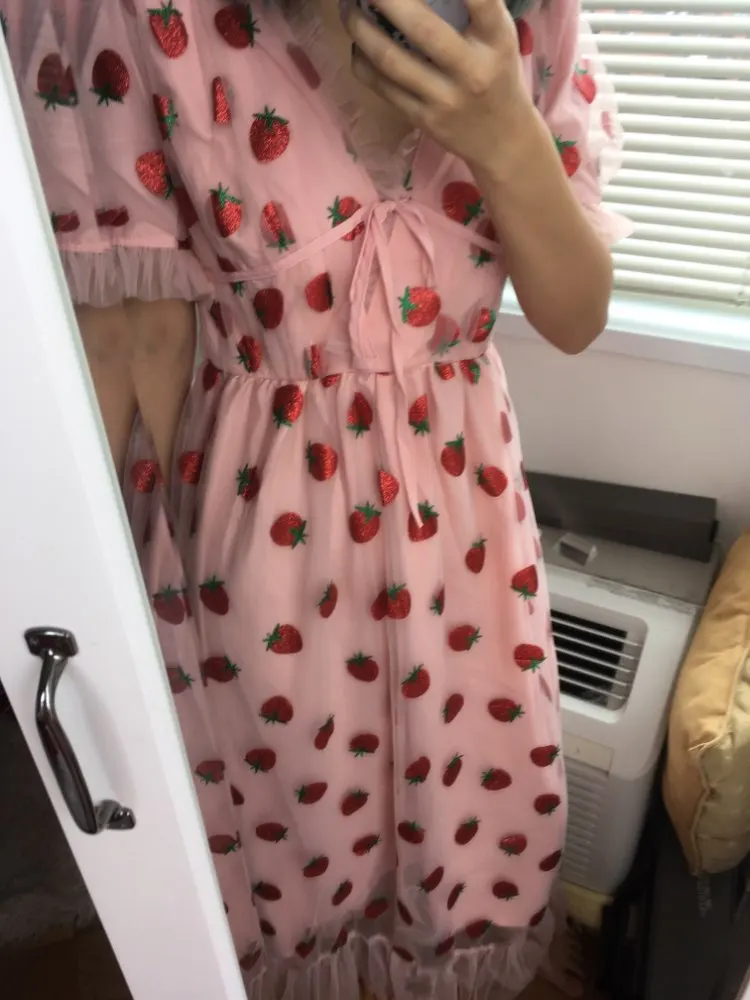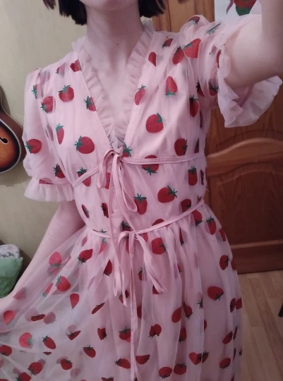 The fabric is very nice it’s very smooth the color is a pretty pink love the strawberries on it just like the photos very shines and the sheer is very nice not a good dress for twirling btw be careful of not damaging the sheer. I got size M it’s Long on me but it felt swell on the top.