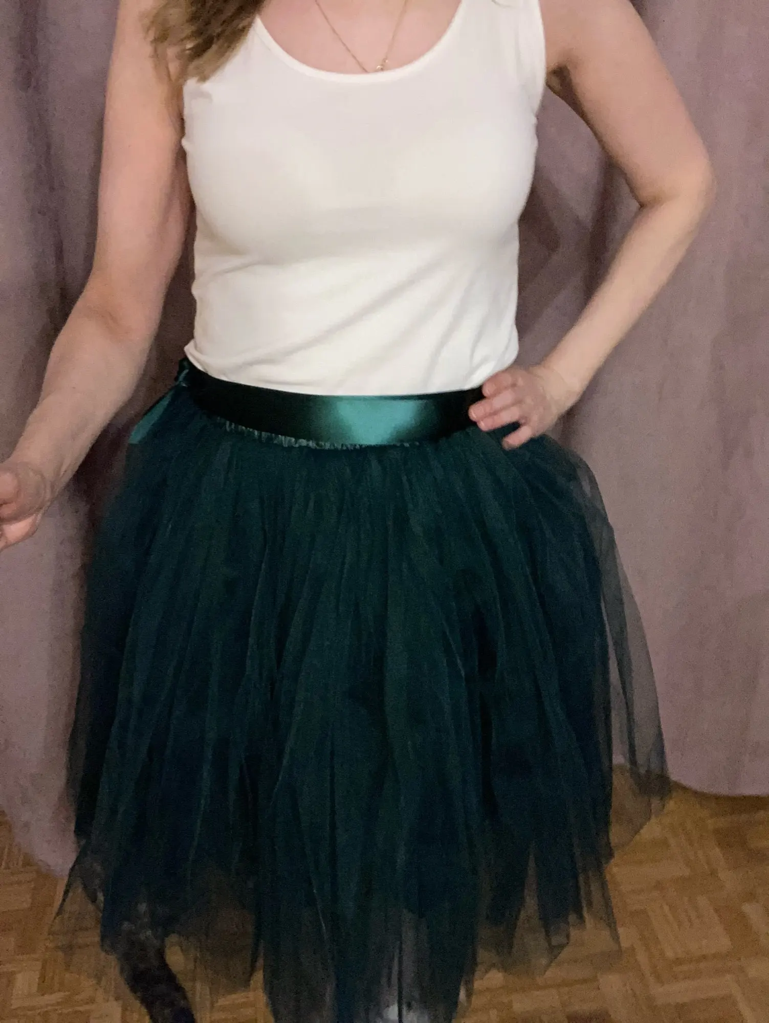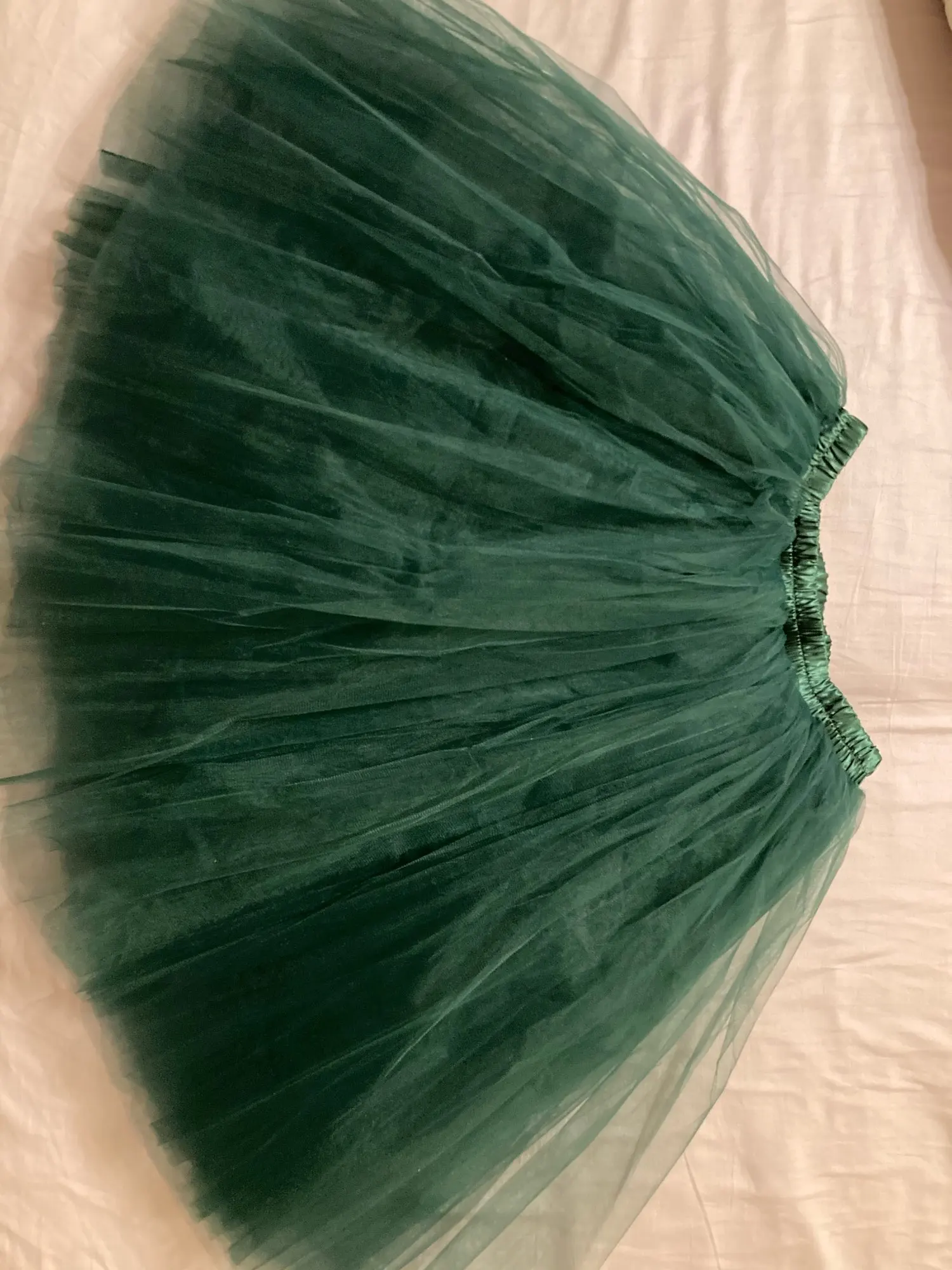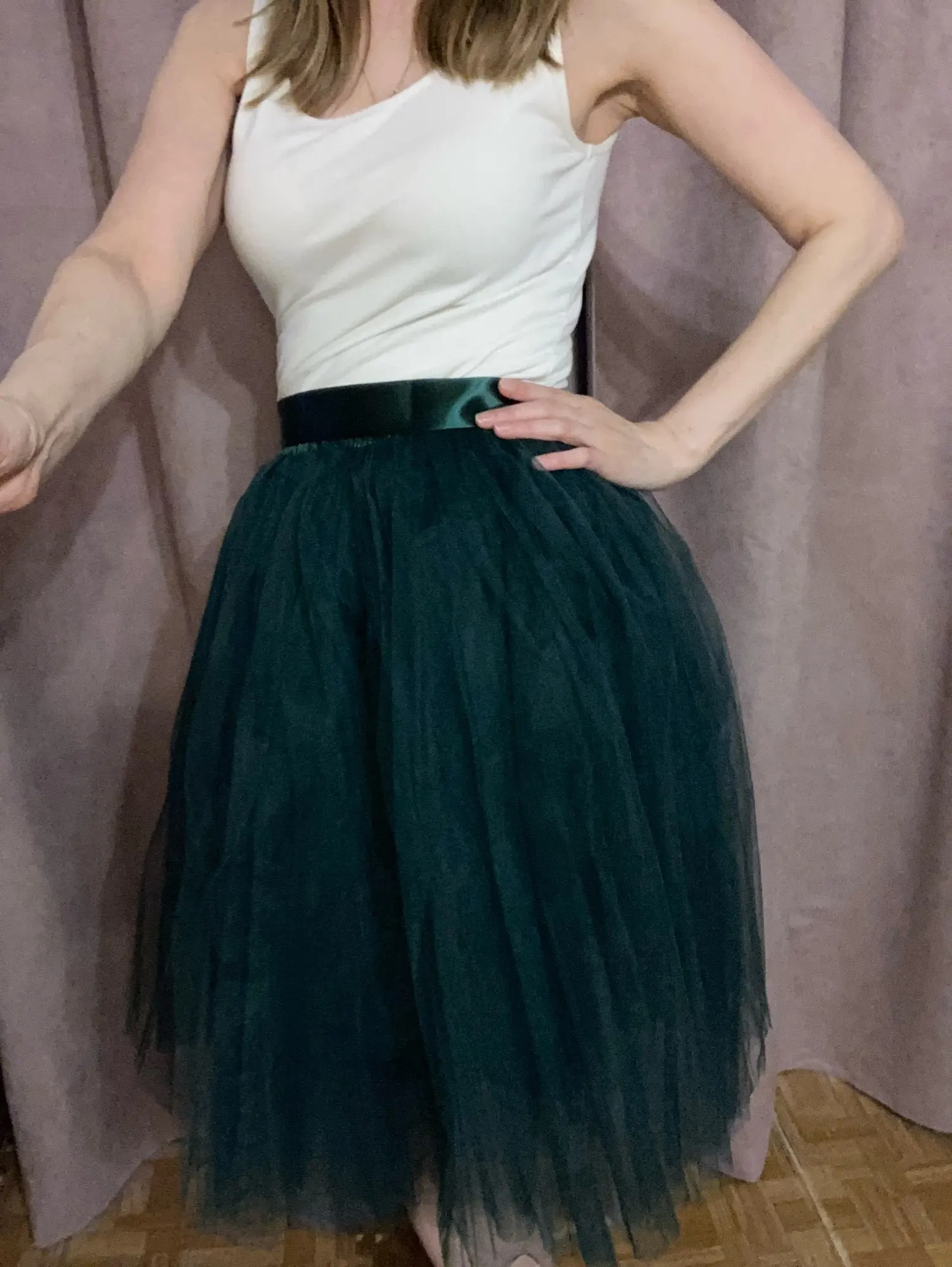 The skirt came in time specified by the store. Fully corresponds to the description. The lowest layer of dark green satin, and on top of 5 layers of tulle-so nothing shines through))) it is attached to the satin ribbon. The skirt is lush and airy! Thank you.