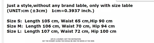 Size S: Length 105 cm, Waist 65 cm, Hip 90 cm Size M: Length 106 cm, Waist 70 cm, Hip 94 cm Size L: Length 107 cm, Waist 72 cm, Hip 100 cm