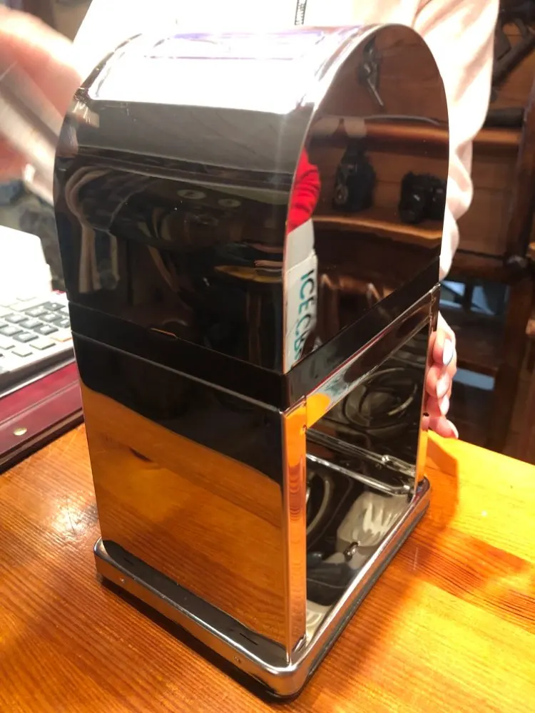 Material: ABS plastic Process: zinc alloy plating Blade: thick stainless steel Net weight: 1600g Size: 16*13*26.5cm 1. Main machine 2. Ice tank 3. Cover 4. Handle 5. Spoon
