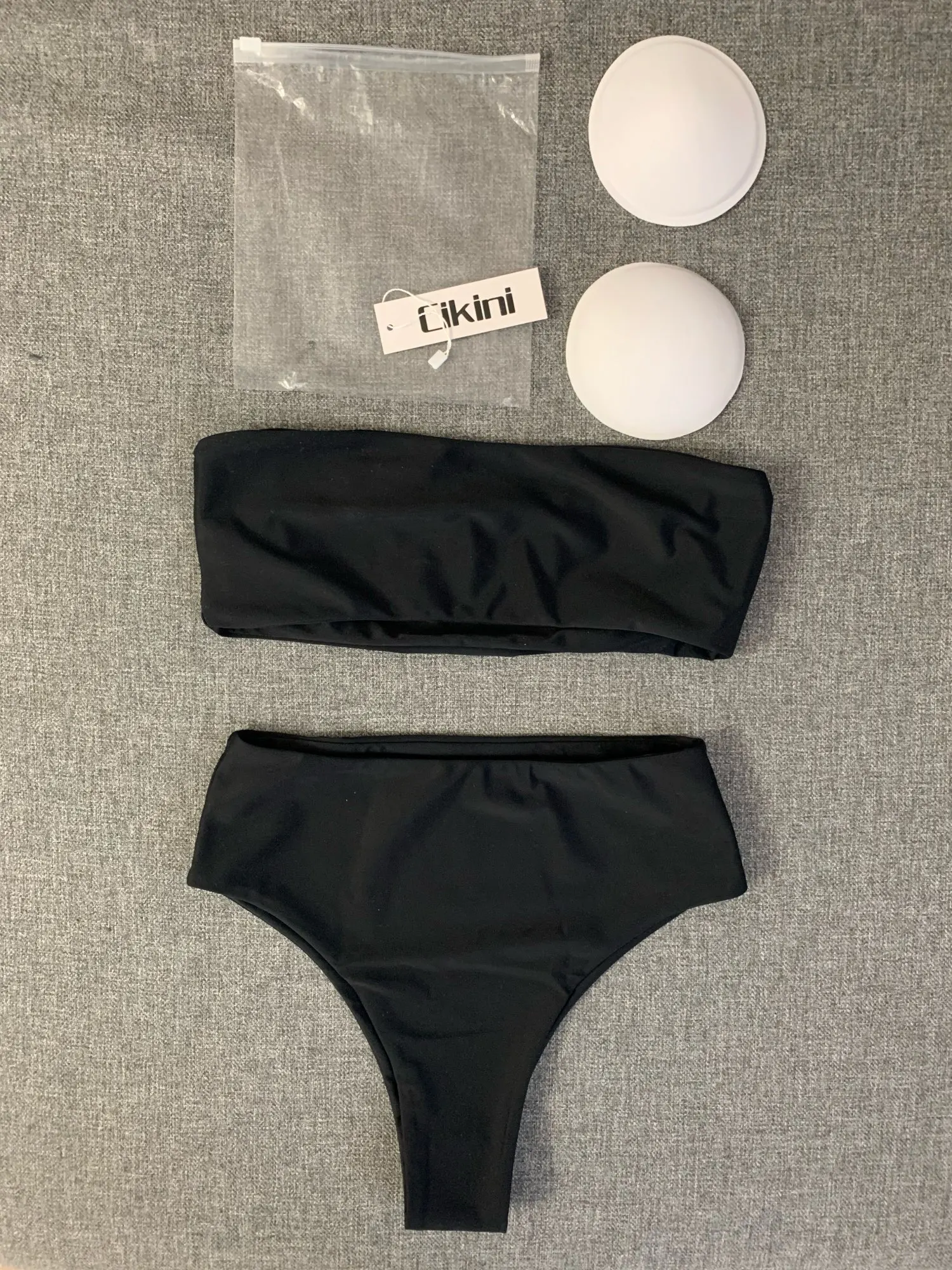 New in 2021 for Women Strapless Bikini Set. Solid Colour Padded High Waist Thong Bottoms Swimwear.