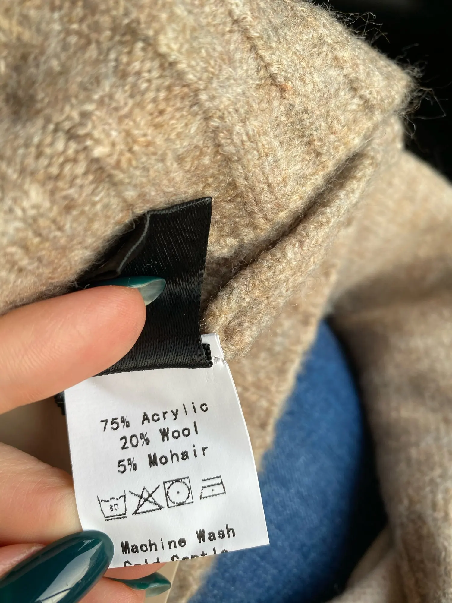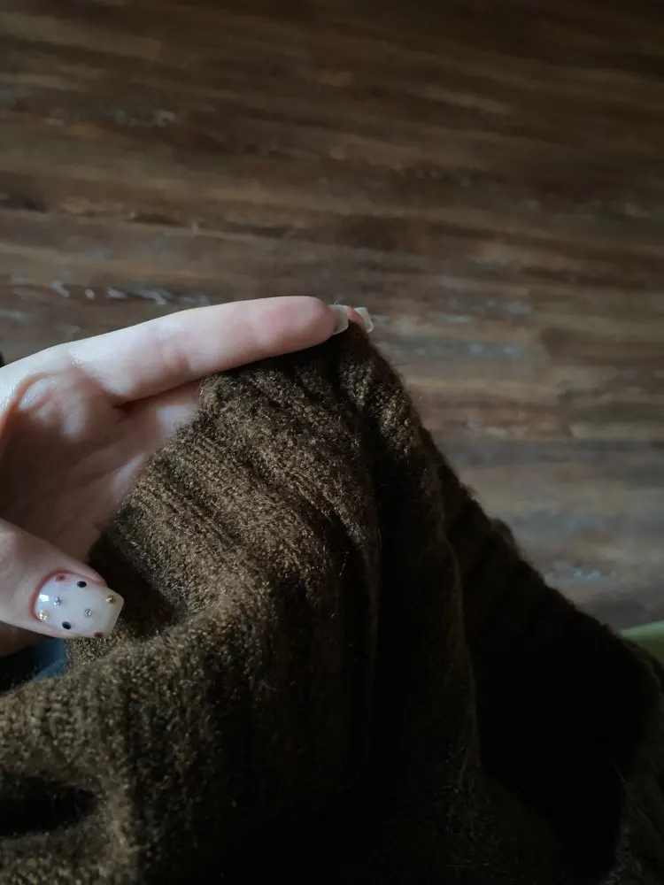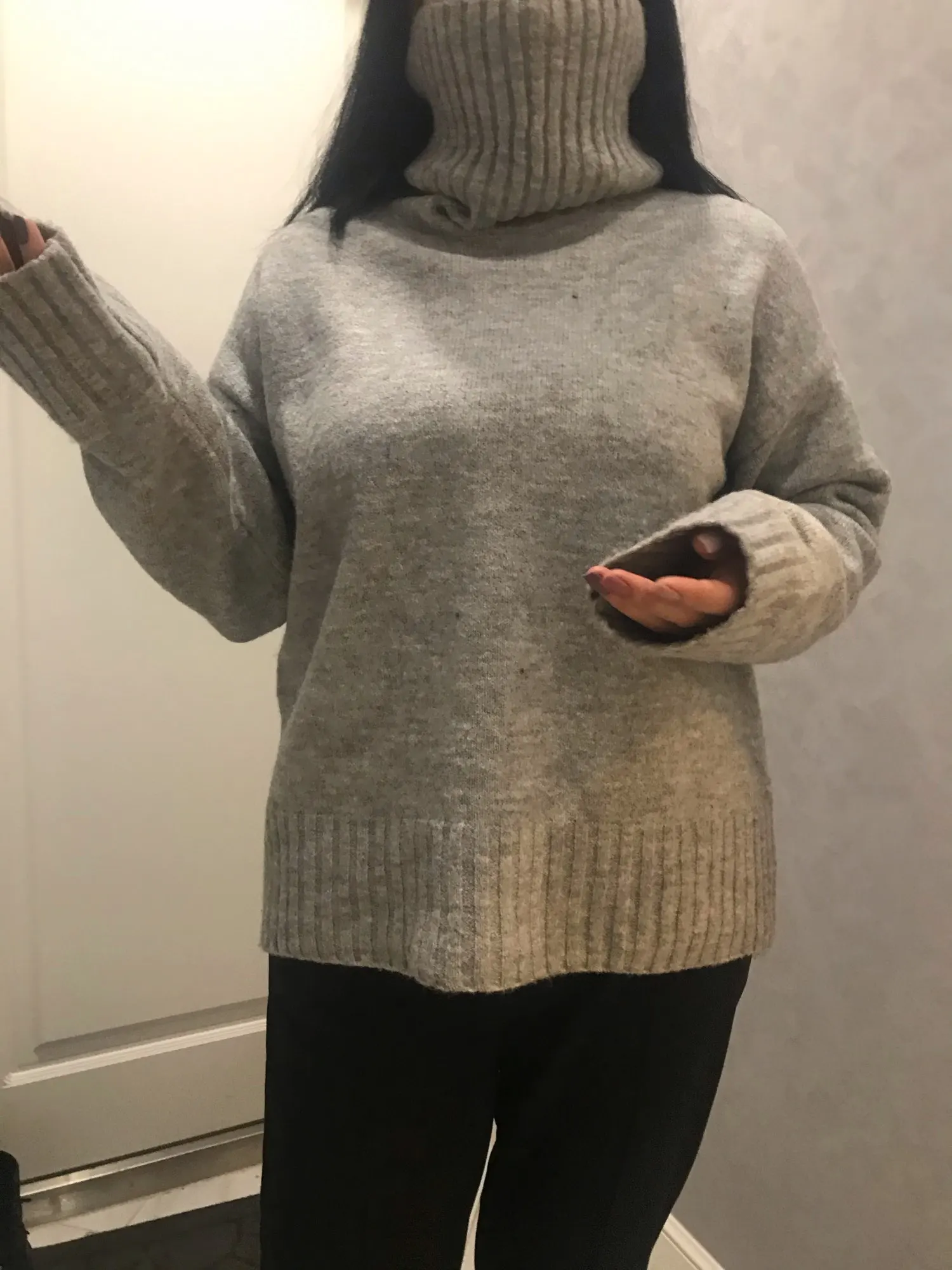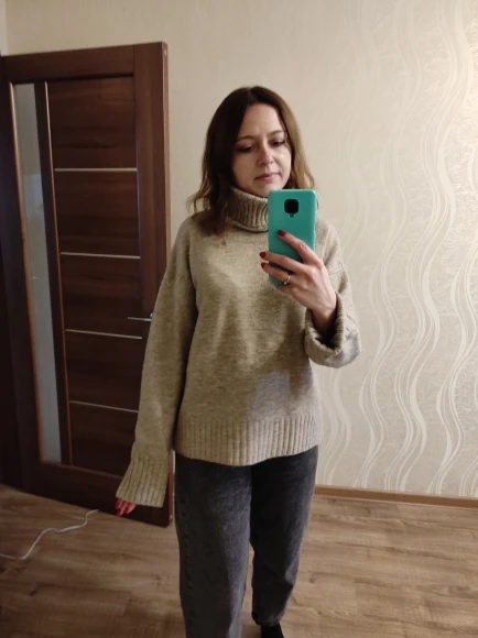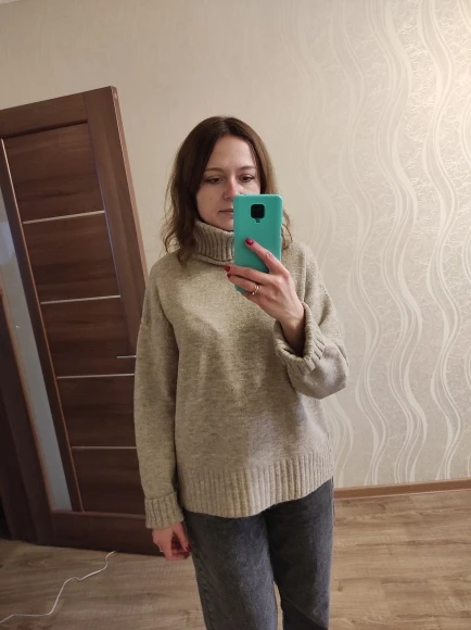 Beautiful, warm, soft and cozy sweater, but just huge. It is not clear why such long sleeves. On height 167 and chest 90 sleeves as in the photo, you have to turn. For winter is perfect, I want to wear it without removing. And the color is universal base, gray-brown warm, under all