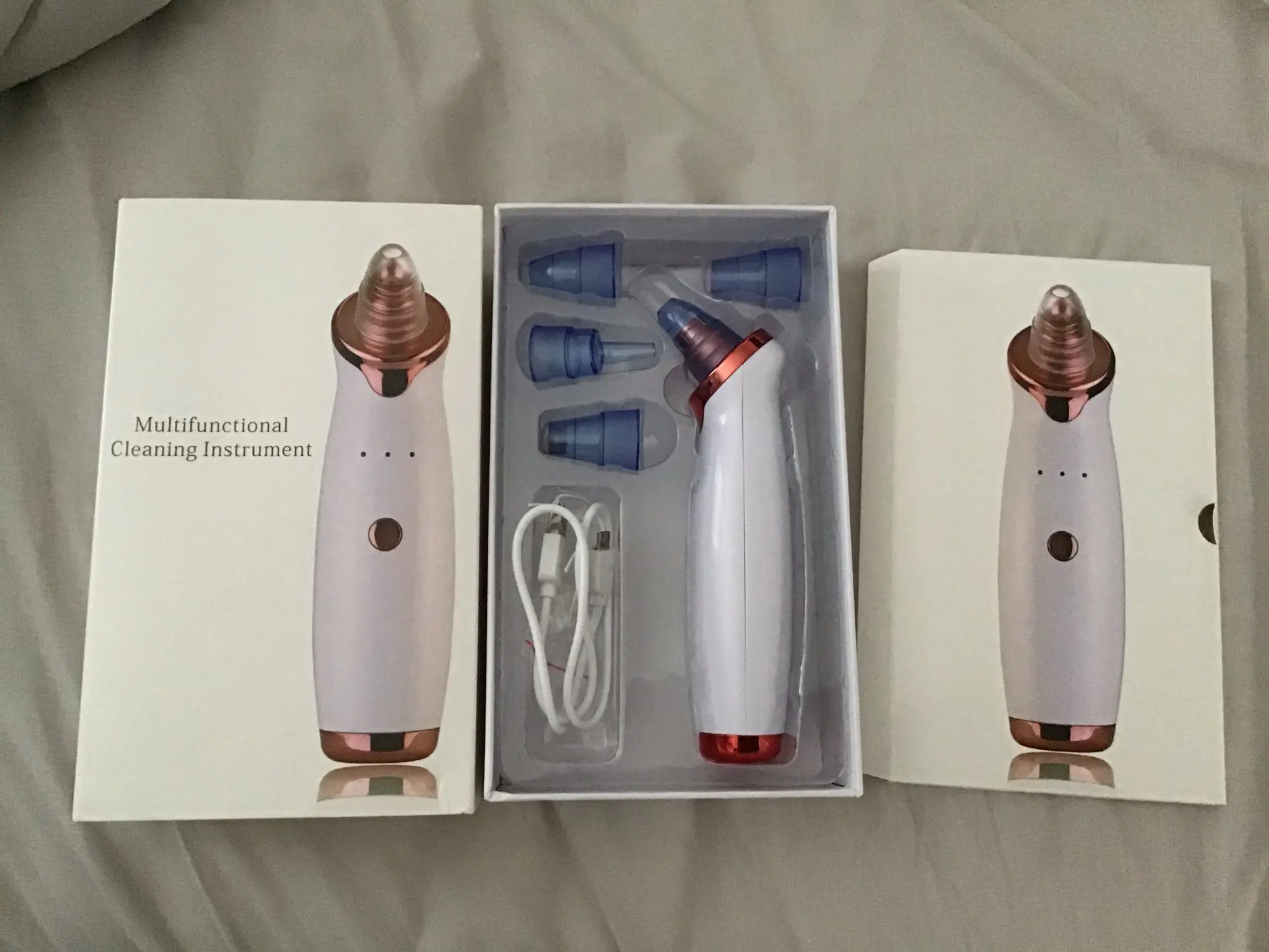 Blackhead Removing Vacuum Tool Item Type: Blackhead Removing Vacuum Tool Material: Plastic Voltage: 5 V Power: USB Charger Package Includes: 1 x Beauty Machine, 5 x  Hole Head, 1 x USB Charger, 1 x User Manual 6 Bundle: you can choose USB line type, US type and EU type in the link's choices! 10633502Bundle4. 10633502Bundle ​Standard type Functions: 1. Remove Blackhead, deeply clean face,rechargeable 2. For acne, pimple skin treatment 3. Treatment for the sagging skin and wrinkle, Skin Rejuvenation 4. Treatment for the stain and dull skin, reduce skin hyperpigmentation 345789 Item 1: Features: 5 Adjustable Suction Force with One-click Design: Pore Vacuum Physical Suction Design from Level1 to Level 5 suction force to meet different facial needs. One-Click design to change the force and long press to shut down the device. 5 Replaceable Suction Heads for Different Skin Needs: provide 5 professional suction heads for different skin conditions. Choice different heads size to fit different face areas. To be your professional home SPA skincare tools. Exclusive Beauty Lamp Functions: it’s the upgrade blackhead remover, add BEAUTY LAMP function. The beauty lamp pattern can be opened simultaneously with facial care. RED LAMP-promote collagen regeneration, tender skin, restore skin elasticity; GREEN LAMP-decompose melanin, bright skin whitening, let skin return water tender and transparent; BLUE LAMP-antiphlogistic and sterilization, the inhibition of skin secretion, repair skin problem of rough and damage. Blackhead Problems Solved: Coarse pore, rough skin, dark skin, exfoliate dead skin, blackhead and pores of the skin, dirt nose, Firm and Improves skin elasticity. Easily cleans up the blackhead, Removes dirt grease inside pores, reduces dead skin and fine lines, massage and tighten the skin. Built-in 500mAh Battery, Rechargeable USB charging. Tips: ✔ Please don't suction on the same area all the time, it will make the skin swell. If the skin swells, stop using it immediately. ✔ Before using the product, use a hot steamer or hot towel or blackhead remover gel/cream on your skin for 5 minutes to completely open your pores first to ensure the best performance of the product. How to use it? STEP 1: Clean your face, use the blackhead Export liquid or facial steamer to open the pore. STEP 2: According to your requirements, choose among the Five Level Suction. Start with the lowest. STEP 3: Move the blackhead cleanser back and forth around the pore with a constant speed, slowly move, do not stay in one place for too long to avoid injury, and do not press it hardly or pull vertically. STEP 4: After washing your face, please use an ice towel or cold water or shrinking liquid to restore the treated pore. Package Included: 1 x Blackhead Remover 5 x Probe 1 x USB Charge Cable 1 x Facial Cleansing Pad 1 x Pack of Isolation Pads 1 x Manual 8 3 9 2 4 5 7 6 10 Item 2: Specification: Name: Vacuum Pore Cleaner Beauty Machine Power: USB Charging Weight: about 282g Size: about 6.81*1.73*1.57 inch Functions: 1. Remove Blackhead, deeply clean face 2. For acne, pimple skin treatment 3. Treatment for the sagging skin and wrinkle, Skin Rejuvenation 4. Treatment for the stain and dull skin, reduce skin hyperpigmentation Features: * suction bigger than traditional comedo suction probe * Five levels, suitable for different skin * Different suction head, different function * Rechargeable, easy and convenient Package Includes: 1 x Beauty Machine 5 x  Hole Head 1 x USB Charger 1 x User Manual   1_21234576 Item 3: New type 34567910 Item 4: Specifications: Product Name: Portable steamer Material: Plastic Weight (kg): about 0.08 Fog time: 61-120 seconds Spray heat: cold spray Gear position: 1 file Packaging size (cm): about 12*3.5*3CM Features: *Moisturize, Hydrate and calm the skin *Control Oil Balance of Skin *Portable Size for Easy Car *20 ml Water Capacity *Continuous Spray for 2 Hours *USB Rechargeable Package Contents: 1* Color box 1* Steaming machine 1* USB cable 217493 Facial Steamer DIY Fruit Steam Sprayer Beauty Machine Nano Ionic Mist Face Humidifier Sauna Facial Moisturizing Pore Cleansing