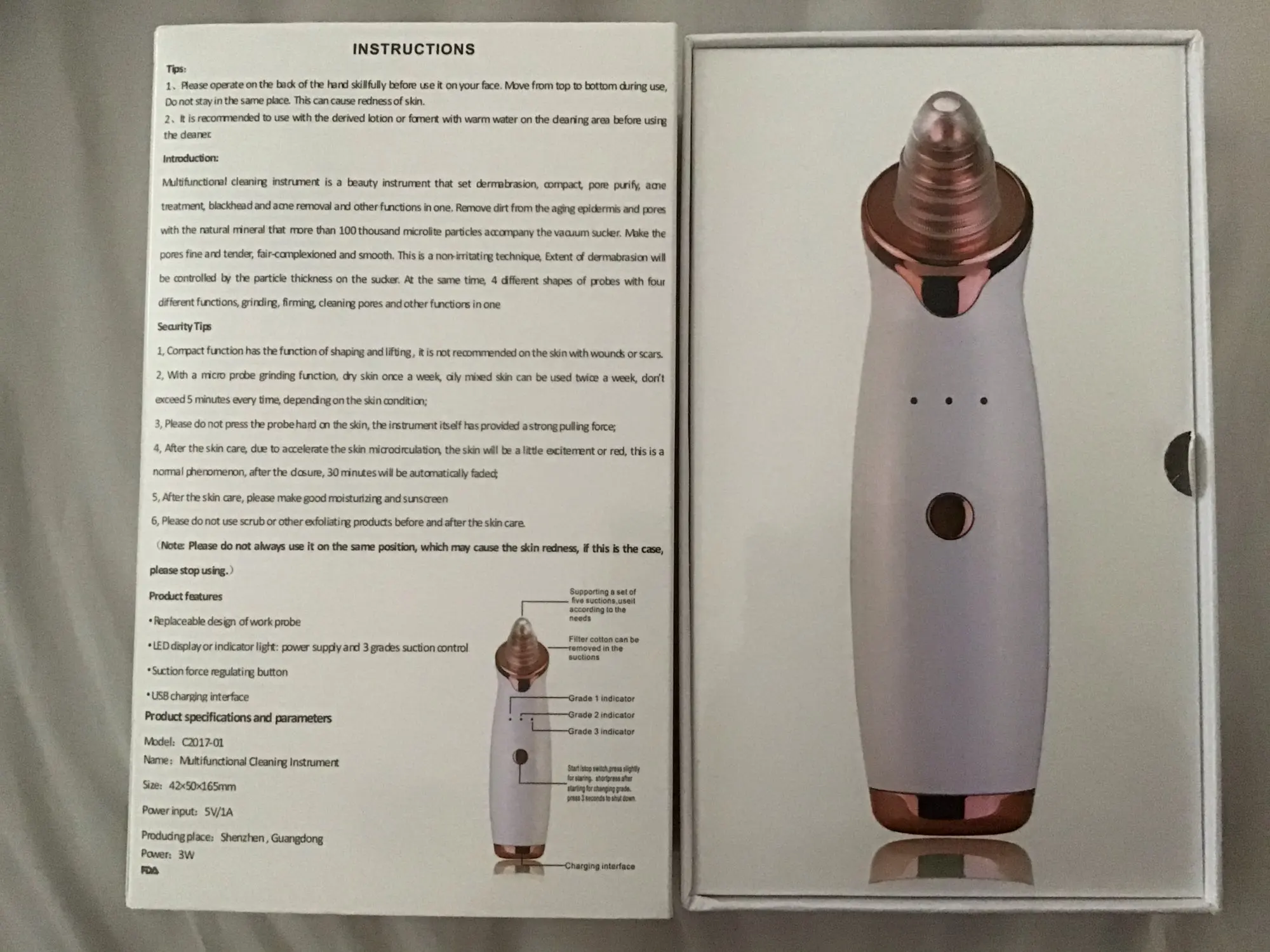 Shipped fast. I received it within the same week. Simple to use. Everything works. Instructions are on the back of the box. The suction even at the highest setting is gentle enough not to be painful on the skin.