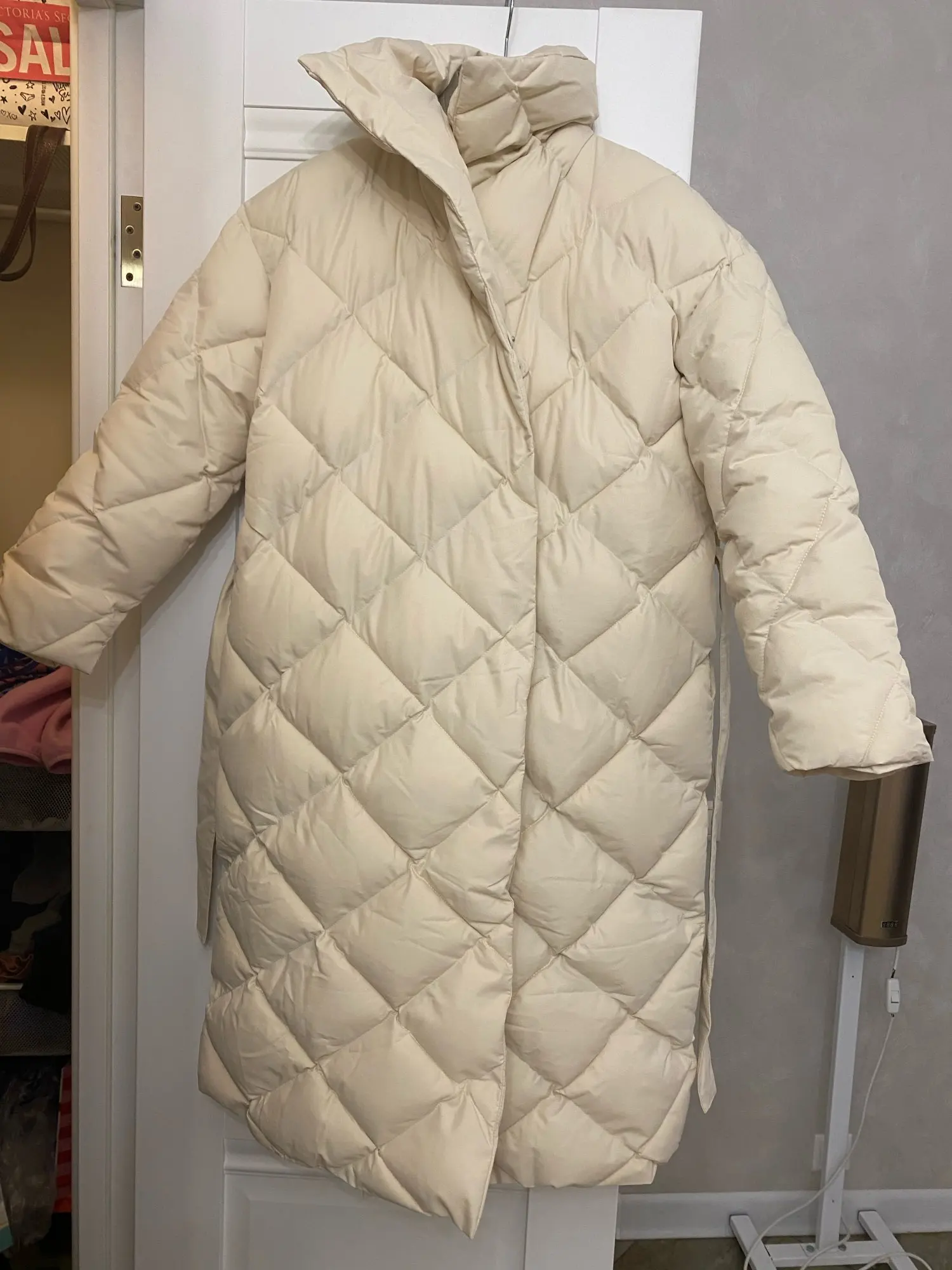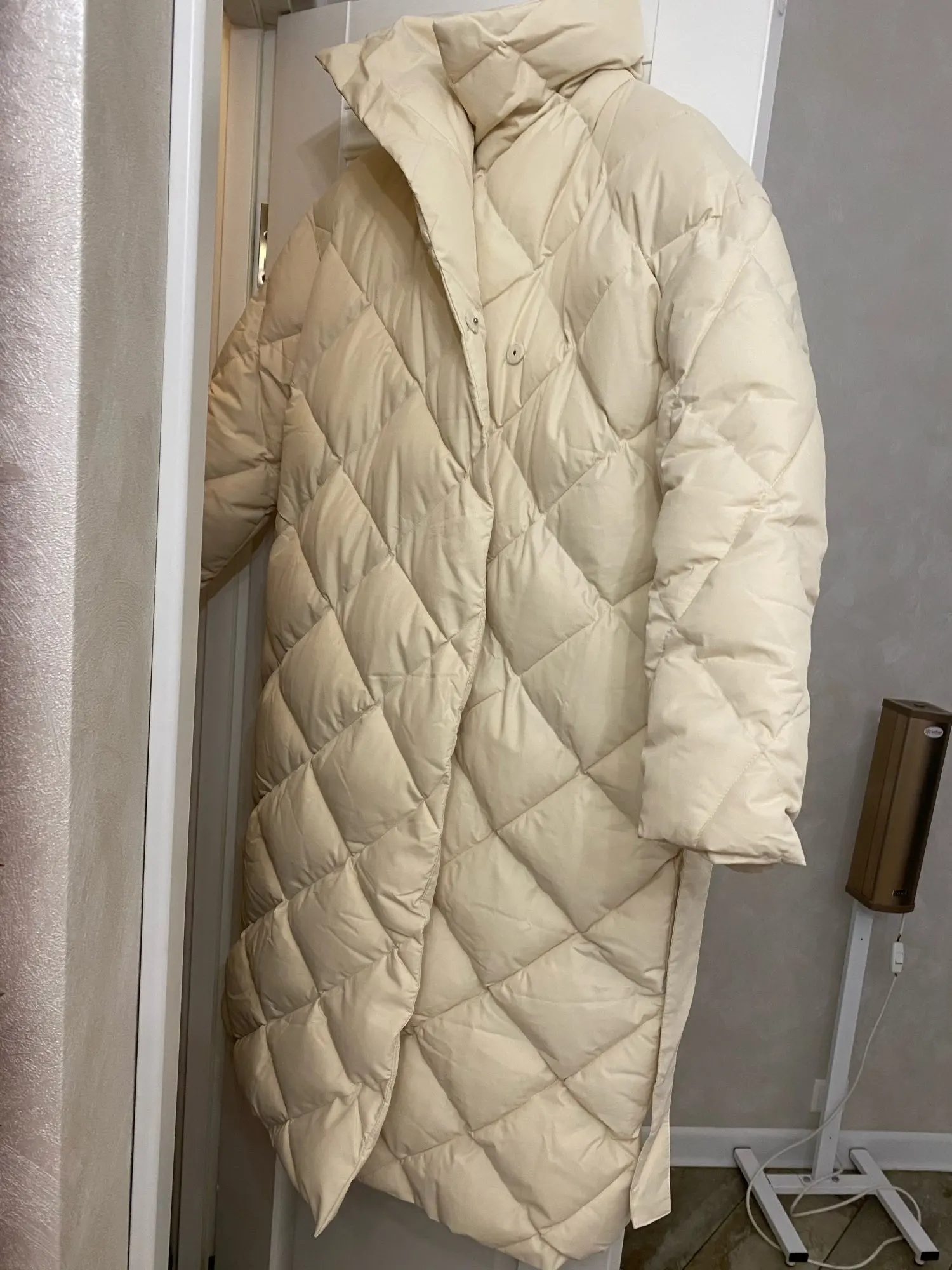 The jacket is a blanket))) the color of the aivori, I wear XS size. On me, 82-62-87, weight 48, height 165 normal such an oversize, on an amateur, I personally like it) you can wear it with a belt and without. If on thin without a belt, then most likely you have to rearrange the buttons. Length on height 165 just below the knees. The length of the sleeve is perfect. Belt without insulation, the collar is also stuffed weak. The fabric of the jacket is dense, sewn smoothly, the threads do not stick out, the pockets are, deep enough. The jacket is warm, in Moscow, minus 10, with a sweater is not frozen. For such money in the mass of such a plan down jacket can not be bought. Recommend