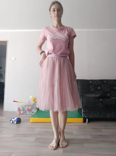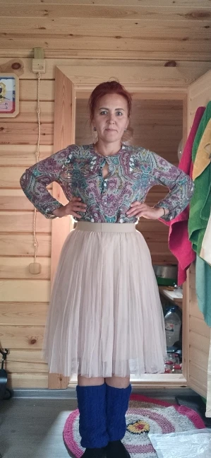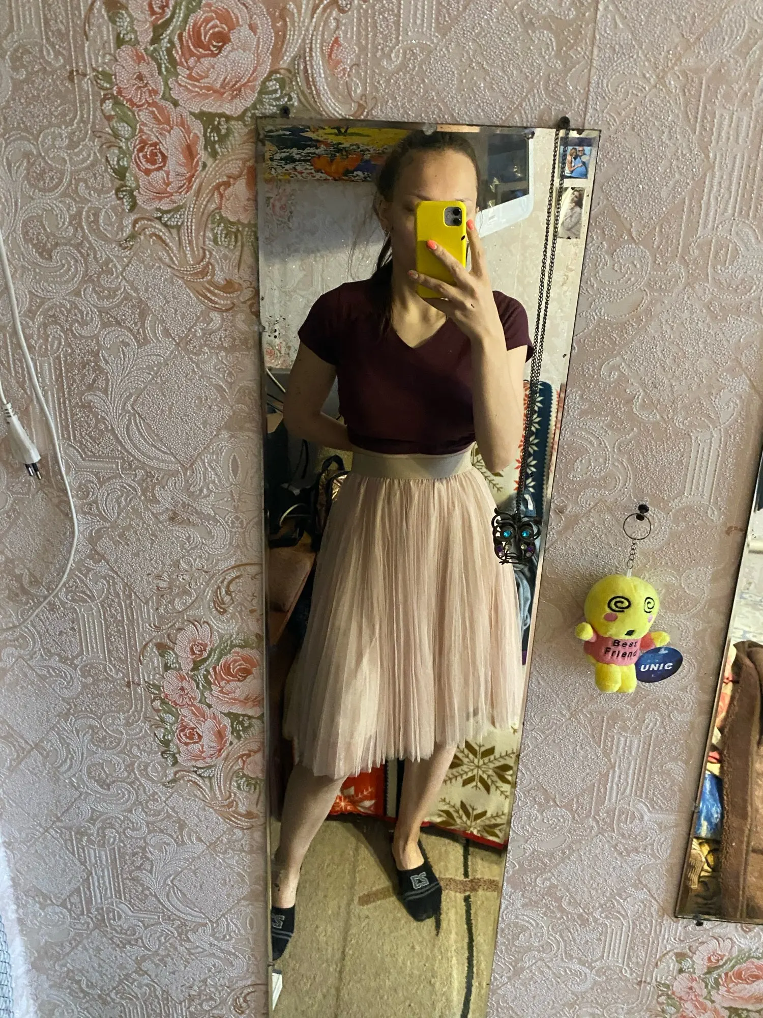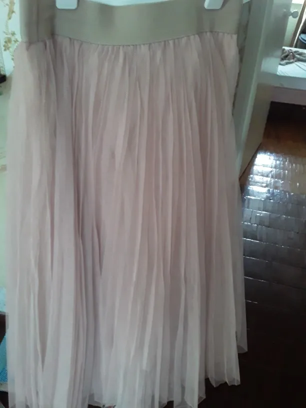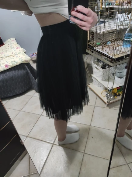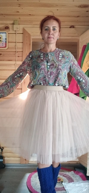 Very mioaya skirt of a telescope pastel color. Pleating from the steam generator does not knock down, although it is ironed with difficulty. But it looks very nice. Not very lush, and soft. Two layers of tulle and lining. I am delighted I recommend the goods and the store to buy.