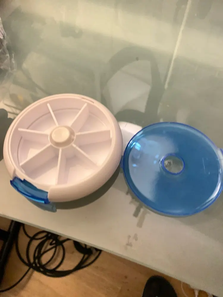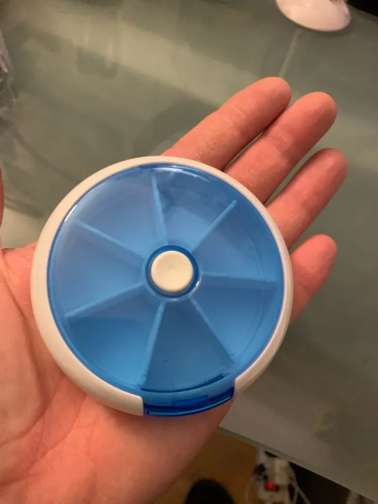 Material: Plastic Diameter : 90mm/3.54"(Approx.) Thickness: 22mm/0.87"(Approx.)   Package includes: 1 pcs pillbox