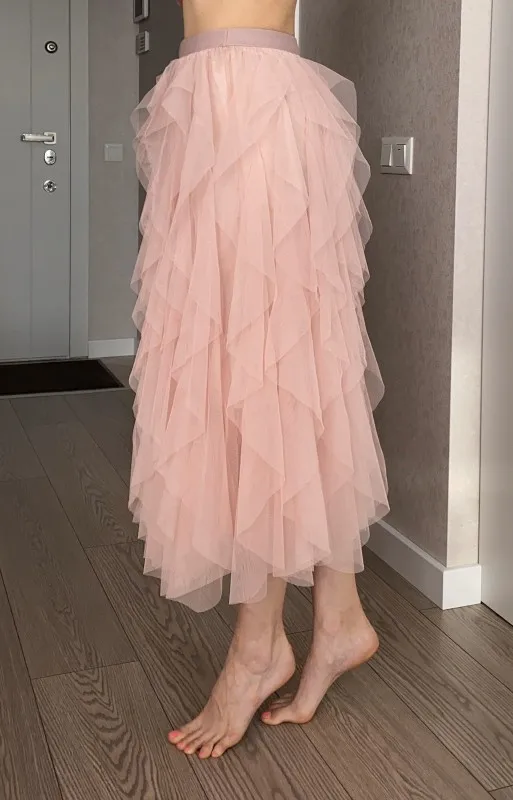 Delivery to Kiev-43 days. Description corresponds (length ~ 84 cm, waist elastic really stretch up to 80 cm, but I think girls with a waist more than 74 cm will already be uncomfortable). The skirt came odorless, the color is dusty pink, beautiful. There was not much thread, there is no tag with the composition, but without it it it is clear that polyester. On the sides, indeed, you can see the place of connection of two pieces of fabric (where there is no fall), but not critical. The skirt is light, thin (but there is a lining), summer. I wear a XS-S and on my parameters (170 cm, 52 kg, 64-90) the skirt sat in size. Looks skirt elegant! I recommend!