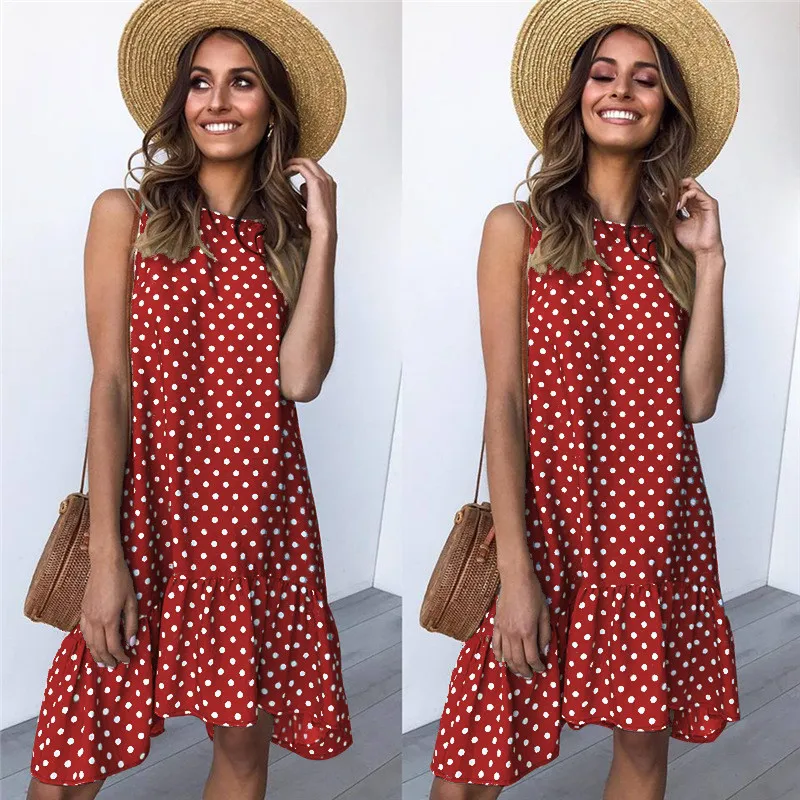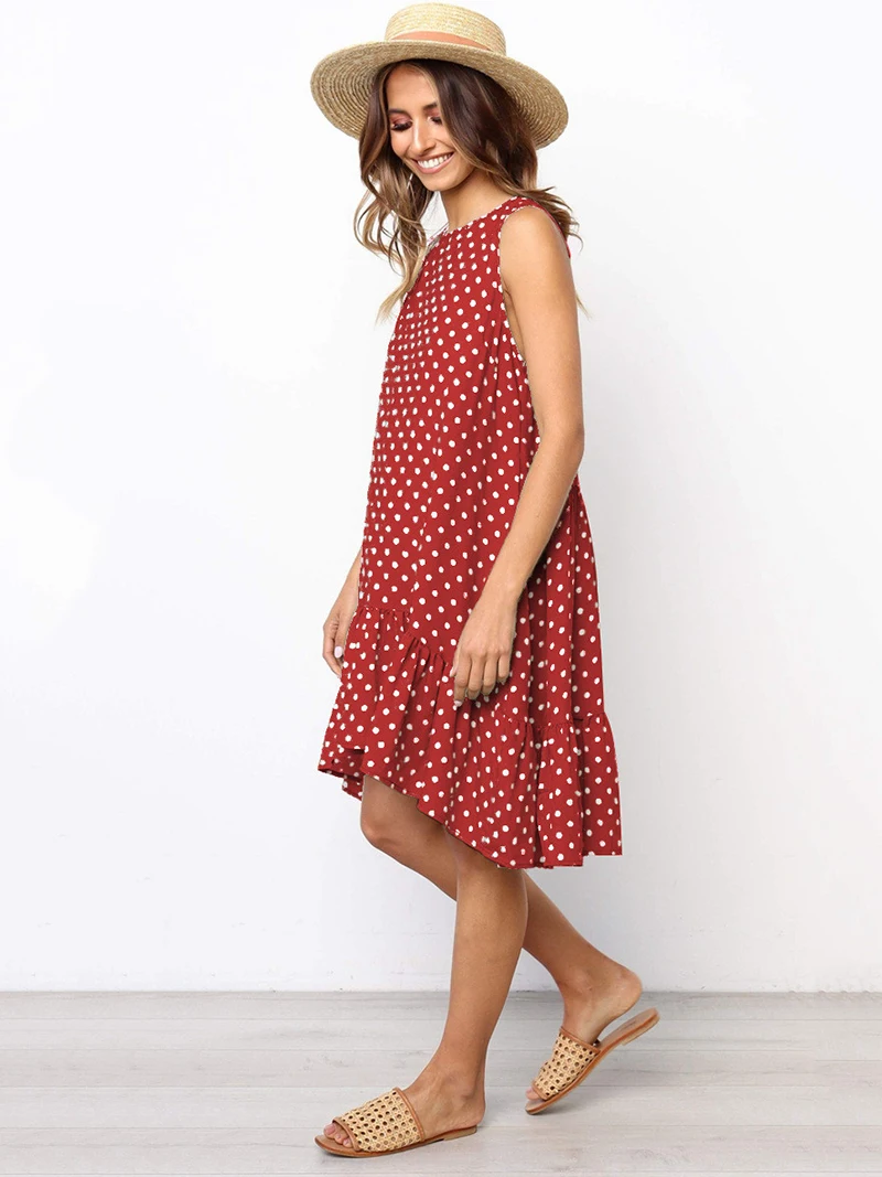 Women's Amazing O-Neck Ruffles Dot Printed Sleeveless Dress-Red