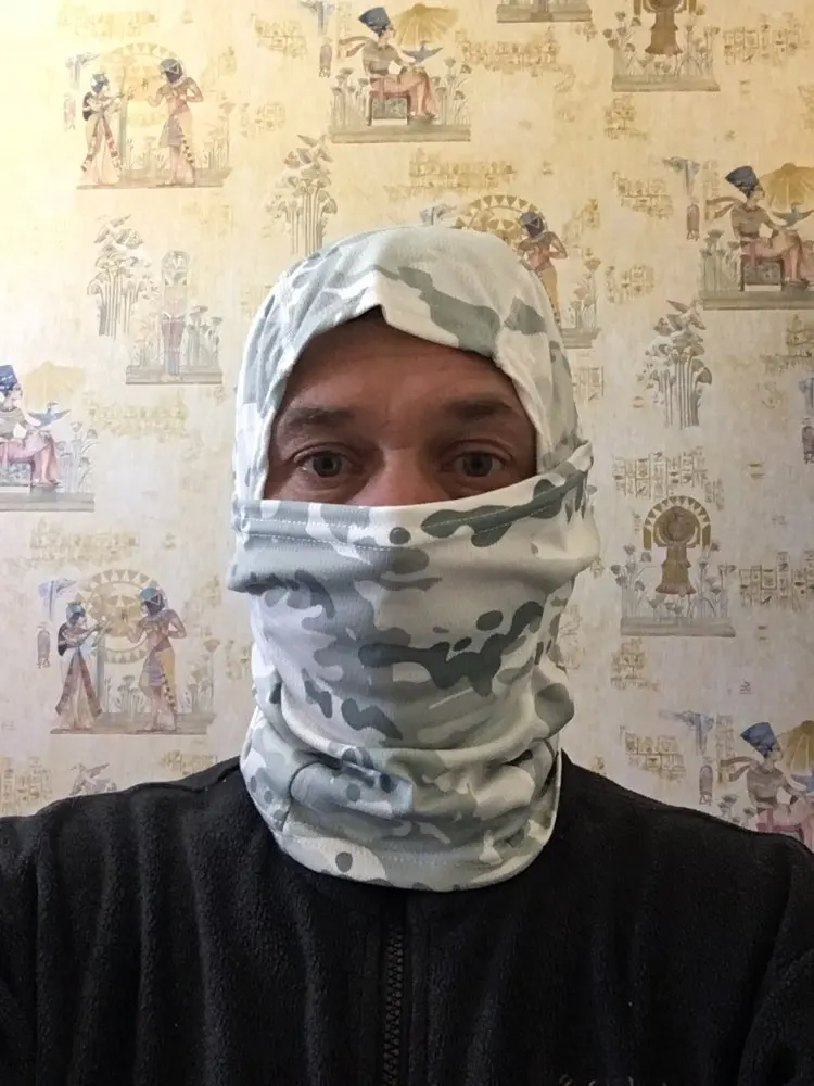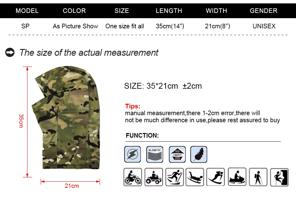 Material: 100% nylon, versatile and fits for all seasons. The material stretches nicely and has pores in the material. Breathable Feature: Thin design, close to your skin and can freely breathe. help to reduce fogging with your helmet on. Can be Worn on its Own or Under any Kind of Helmet. Tactical balaclava covers your head blocking from dust, sun UV or snow. Super Comfortable wear them perfect for spring, summer, autumn and winter: Suitable for outdoor sports, climbing, running, cycling, motorcycle, motorcycling, biking, trekking, boating, skating, hunting, shooting, skiing, surfing, hiking, Mountain Climbing, Snowboarding, snow machining, airsoft paintball, tactical training and other outdoor activities. Size: Length: 35CM(13.78in), Width: 21CM(8.27in); It is thin and fits a bit tight.
