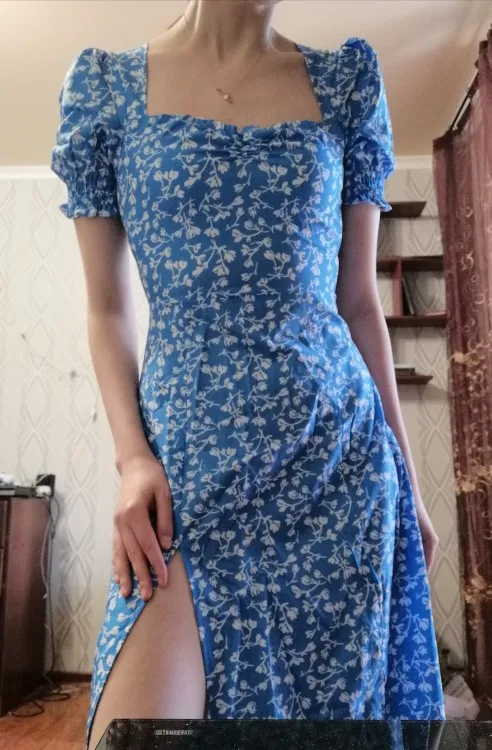 The dress corresponds to the description. The fabric is thin, slightly stretches. On my 88-70-96cm height 161 cm approached the size m butt. The color is bright. Thank you!