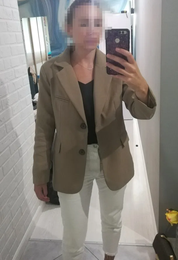 I am normally S or M size, wanted a more oversize look ended up shoulder is just nice for me. If aiming for oversize look, should get a much bigger size. My shoulder is 37cm. The button is gigantic. Delivery took very long. I ordered it on 18 August, received it on 9th October! But the store is very responsive. Thanks for the free hair tie