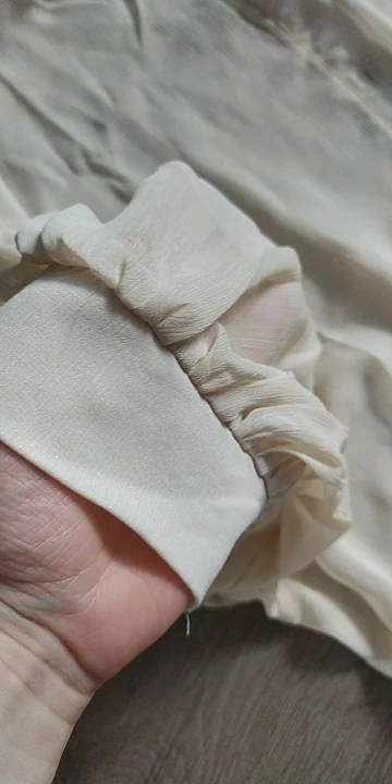 One of the best orders. That's straight pleased with the thing. The shirt is so versatile that it can be worn with both trousers and skirts, and with jeans, and shorts. Also an excellent solution for those cases when it is not made to bare the shoulders. The fabric is thin transparent chiffon, slightly compressed. The color is not white, milky. My parameters are 86-65, height 168.