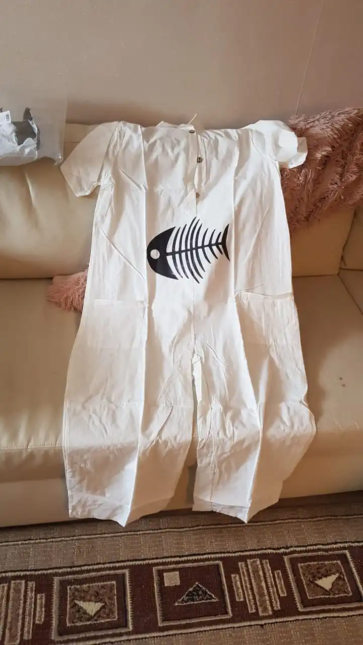 Overalls made of fine cotton. On a small height. Does not shed when washing. Matches the photo.