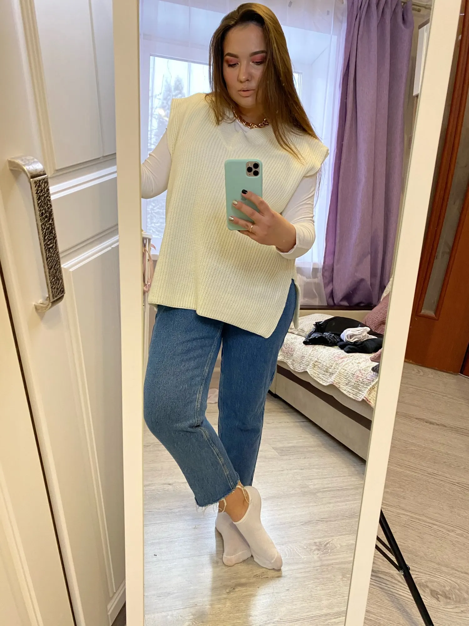 Trend vest This year all the women of fashion bought these vests, and finally came mine) I really liked it very much. The color is exactly the same as in the photo. The material is dense, keeps the shape perfectly Machine binding Slightly unclear are the edges of the sleeves, but it does not confuse me and the general appearance of this does not spoil at all. There was no thread, no unpleasant smell. It reached Mo in two weeks in Pyaterochka. On the parameters og 90 from 78 to 104, the growth of 163 chose the size L and this is straight the ideal oversize. Looks very stylish, you can wear both with a shirt, and with blouses, dresses, cool will look with a dress-shirt also free cut, and in the warmer season you can stylize with a T-shirt. To buy recommend)
