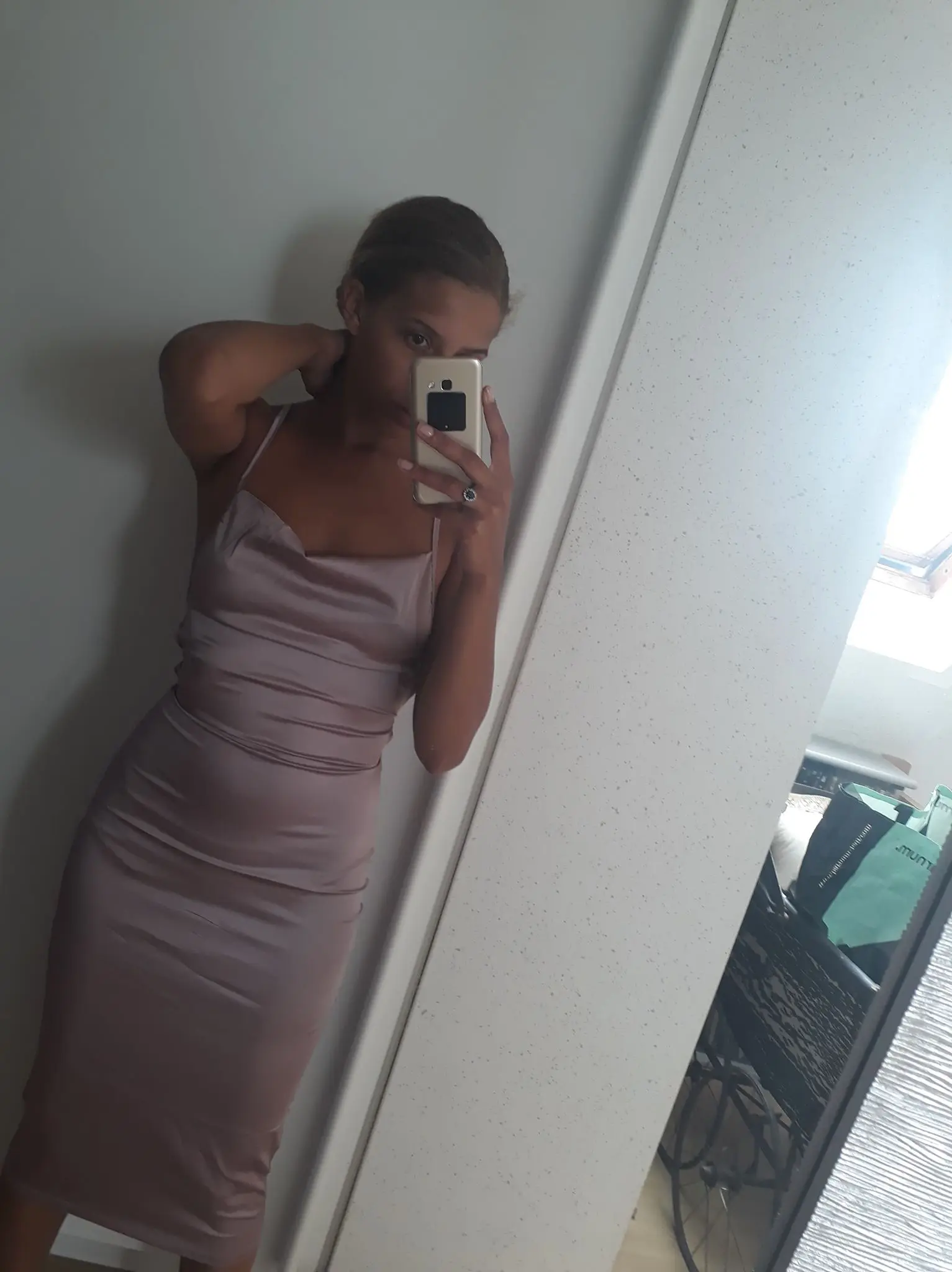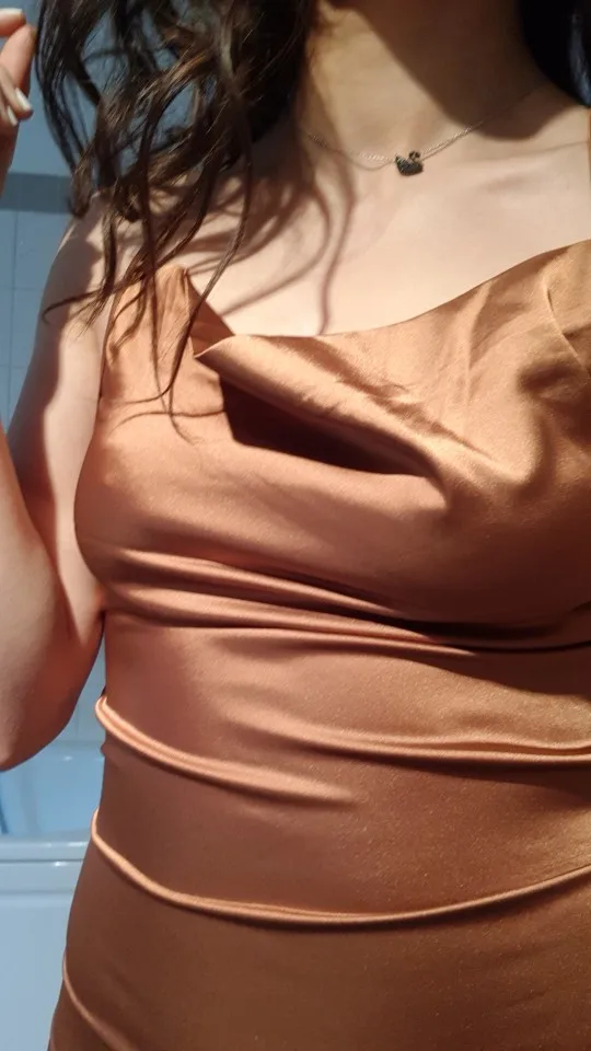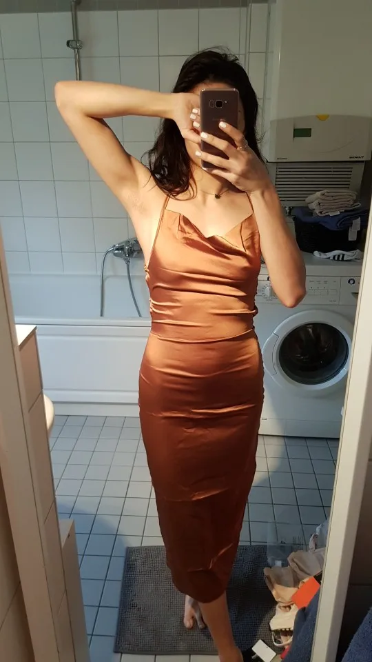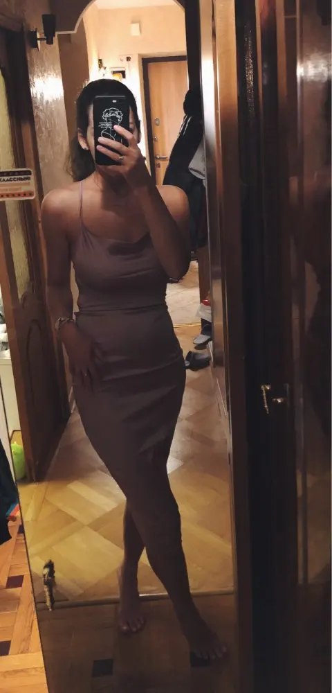 The dress is excellent! Threads do not stick out, sits well, nice satin. Matches the photo. Read reviews and ordered M, but it would be better to Village s. My parameters are 90-62-88. If you have a waist less than 65cm-take s. The dress stretches and climbs on any ass)
