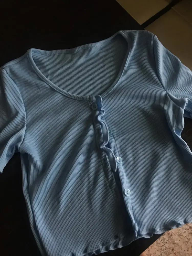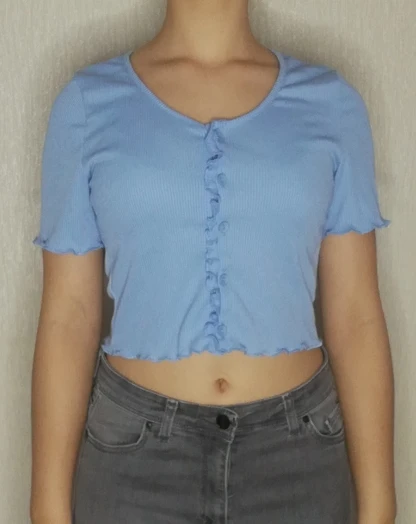 2021 Women Stretchy Ruffle Sleeve Tight Rib-knitted Plain Summer Button Crop Top