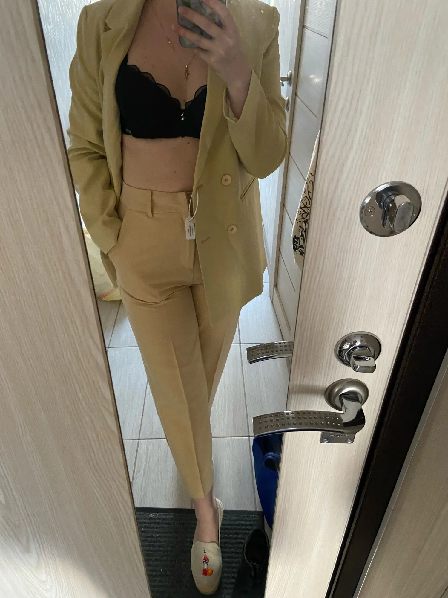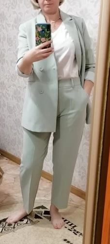Chic pants! Fabric, sewing, density-everything is on top. On their parameters from 78 and about 98 took XL and they sat down just fine! At the waist do not sagging, in the groin do not bubble, in the straps do not pull on and because of the density of the fabric and successful cut does not show cell. On the last photo I dressed them for a mint jacket Nelva, under it they ordered. The color was perfect. Now I gently love sea-malls store.