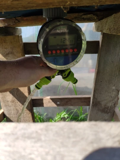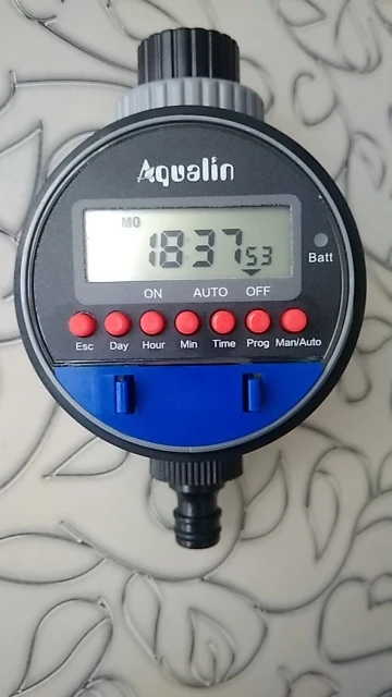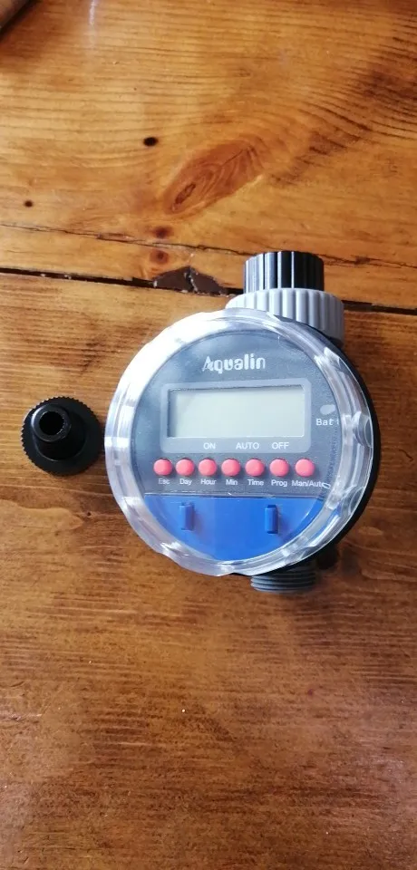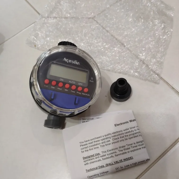 Automatic Electronic Garden Water Timer with LCD Display Item Type: Garden Supplies Material: Plastic Working Temperature: 5 - 60 C (40 - 140 F) Water Pressure: 0 - 8 bar (0 - 116 PSI) Size: 9 x 9 x 16.5 cm Weight: 280 g Features: Garden, Garden Supplies, Watering, Irrigation, Garden Water Timers Product Description: >This timer allows you to set it and it will do the watering for you. >Please close the top lid very tight, to make sure water can not go inside Features: > UseLR032XAAA 1.5V Alkaline battery (not included) > Durable high impact construction > Clock time display >8 different Programs ready to be set > Simple, reliable, water-proof > Working pressure: 0 to 8 bar(0-116 PSI) >Working temperature:5-60C(40-140F) > Can be attached to3/4''(19mm)tap or faucet > Manual Watering: can be set for one time instant manual watering > Manual ON, Manual Off, Auto mode > Frequency can be set per day, or each day of a week, 15 different day choices https://ae-cn.alicdn.com/0efe2qM6P4YqWAN8QQd/Yk0oChObKhH9vRZIQ5m__hd.mp4