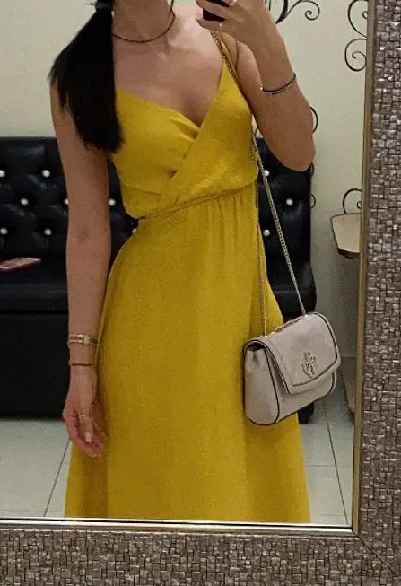 Платье пришло быстро, соответсвует описанию) выбрала желтый цвет) правда у меня повязки ниже резинковый пришиты, но мне не мешает это)