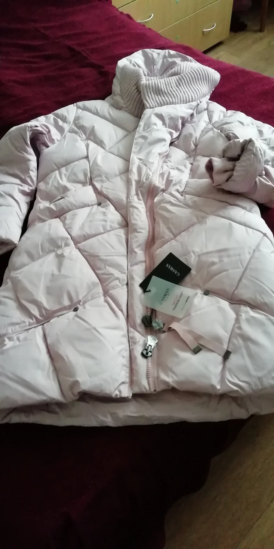 Quality as always on top. Came down jacket in a branded bag with a zip lock. It is very convenient to clean it for the summer. Already Bought myself such a jacket 2 years ago, only pink. So far in excellent condition. Now I ordered my daughter. Size fits. The accessories are excellent, wrapped in cellophane. In general, very satisfied with the purchase. I recommend it to everyone.