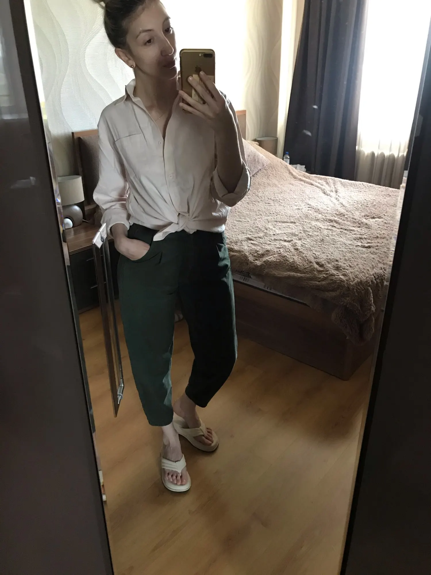 The order came quickly, the fabric is not completely cotton, there is a admixture of synthetics, as after washing the fabric is unknown. The style is good, I have a size M, I took it to be an oversize. The length is cool, the sleeves are not short. My height is 175