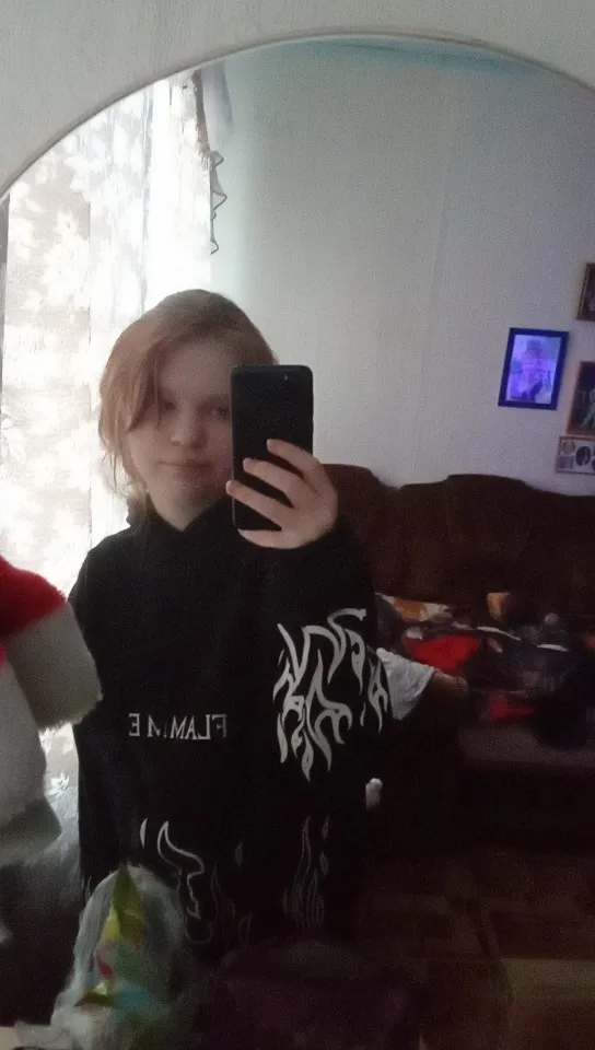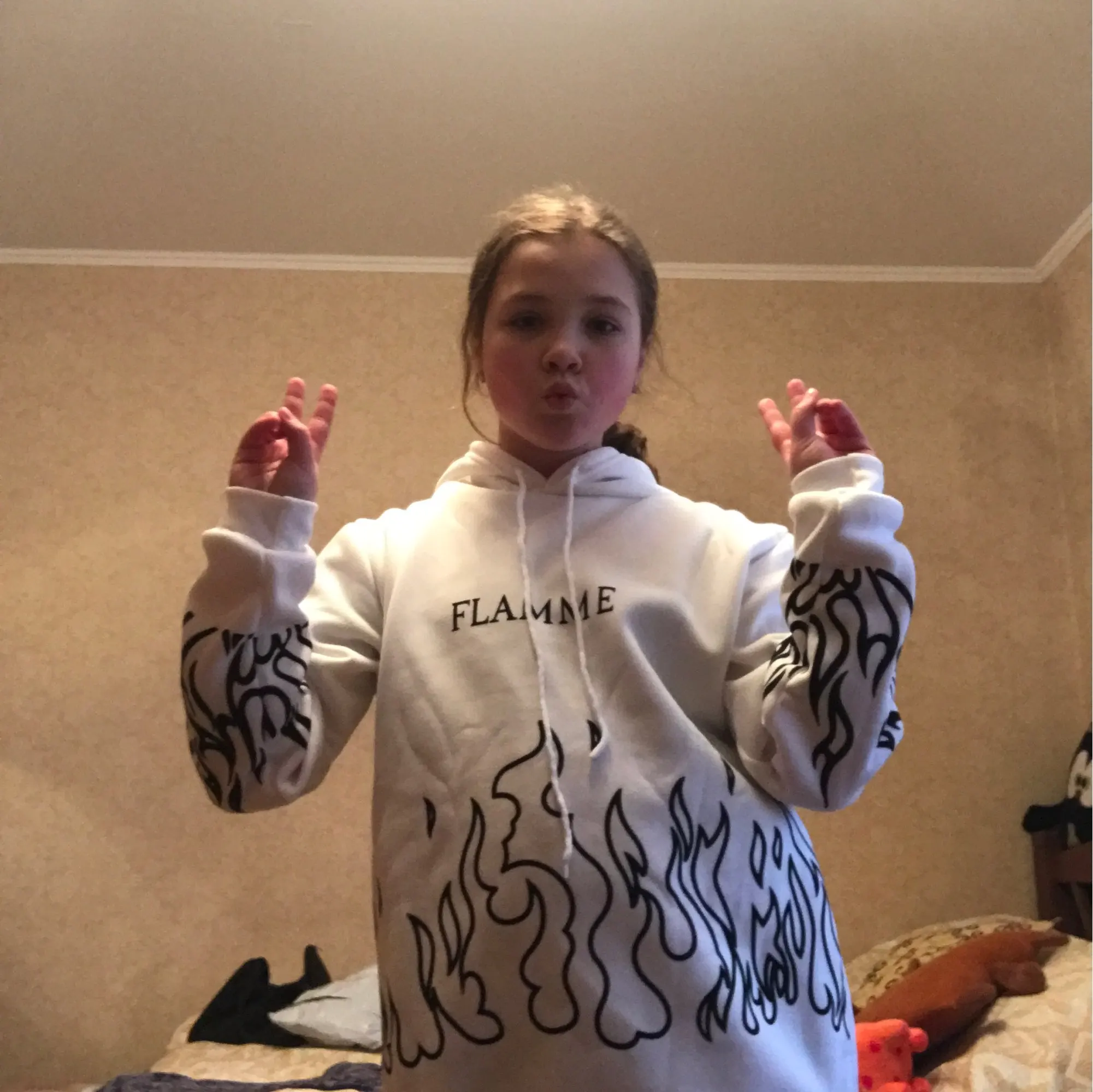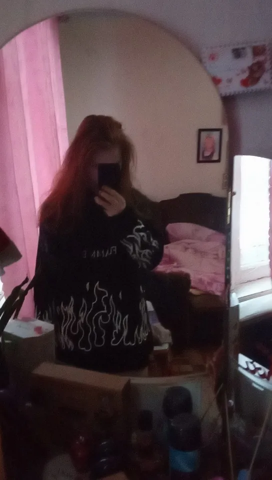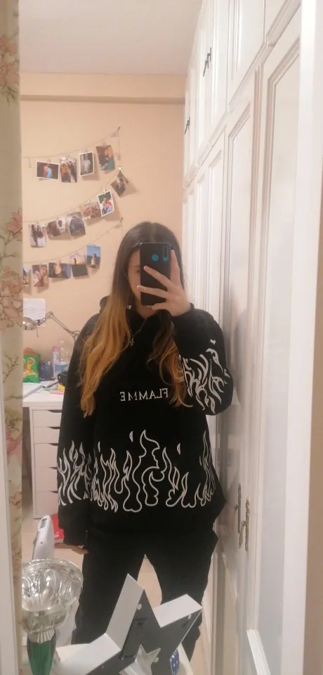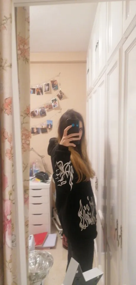 Sweatshirt afigenic. Baggy and inside is so soft. I just advise her I wanted to be an oversize and choose L I can say one she is cool.