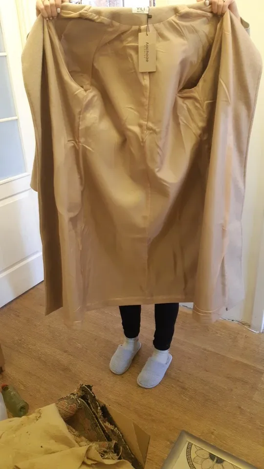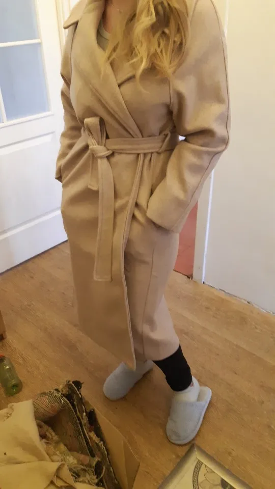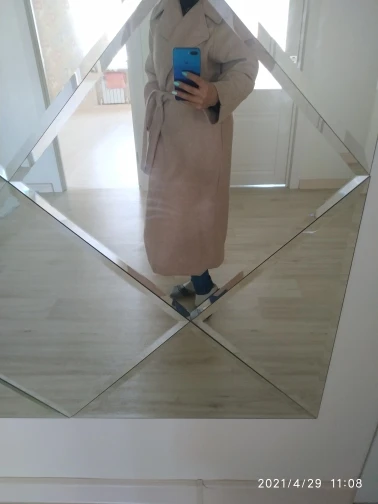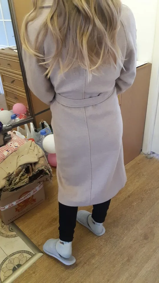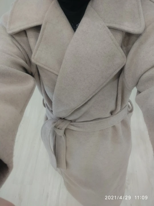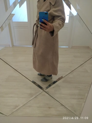 The coat came earlier. Quality is super. Ironed, in the future, when worn does not crumple. Two deep pockets, without buttons, with a belt. It looks great. The color is the same as in the photo. I'm 154, I'm long, but now I wear elongated models, so I will not shorten it. Thank u!