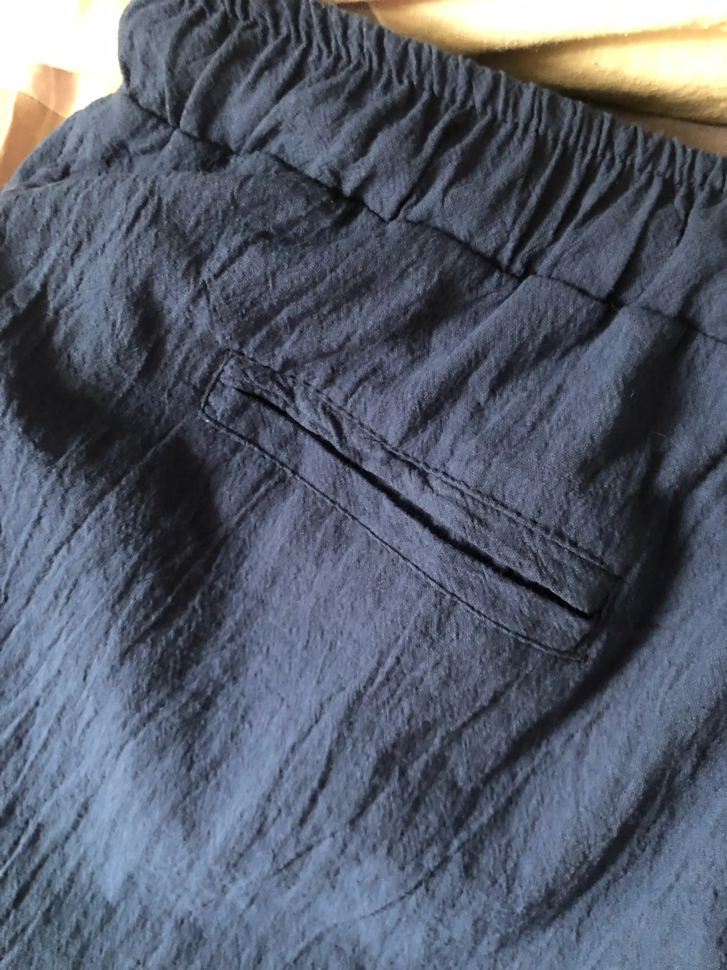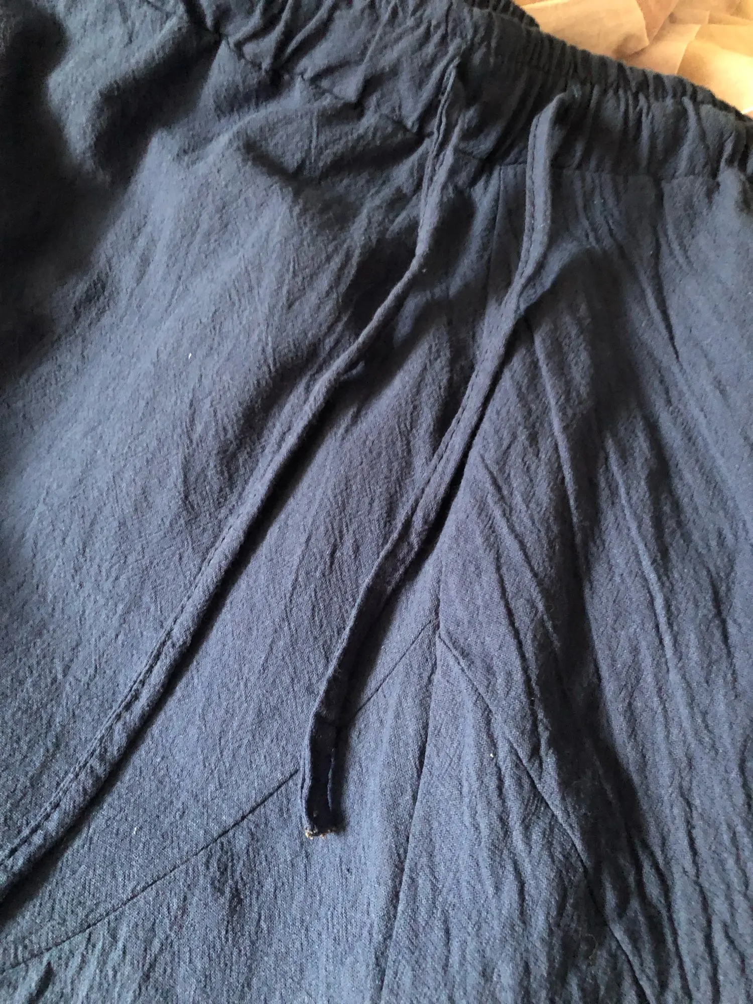 Точно как на картинке. После стирки без глажки эффект гофре ткань, просторные, удобные. Мужу на размер L брала XXL по размерной сетке продавца. Пришли за две недели. Нитки торчали, убрала их (прижигала, чтобы не распустились). Сшито все нормально. Ничего не успело распуститься.