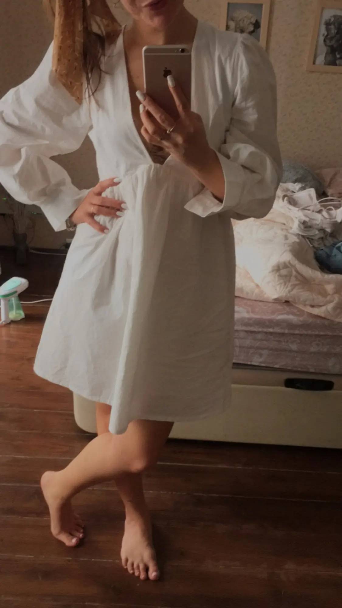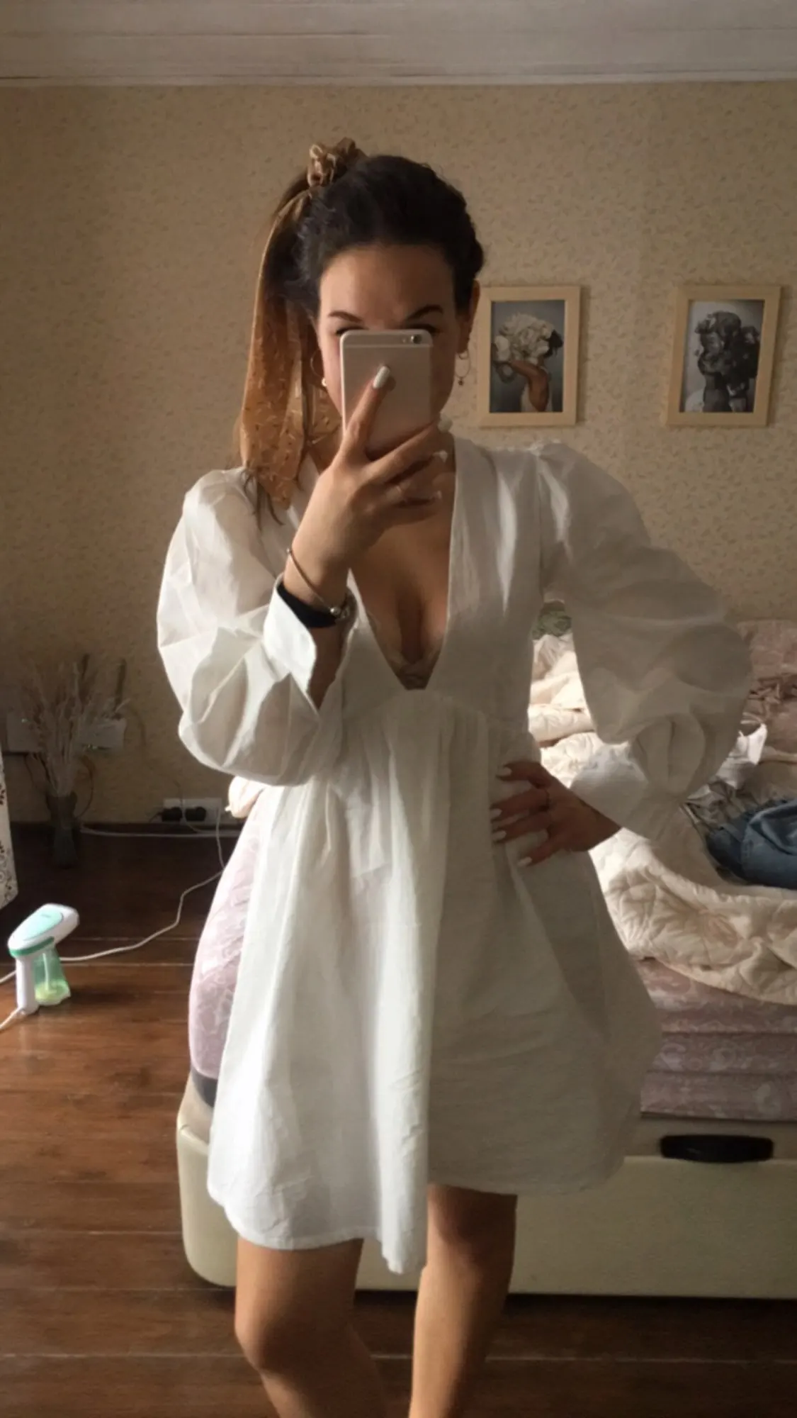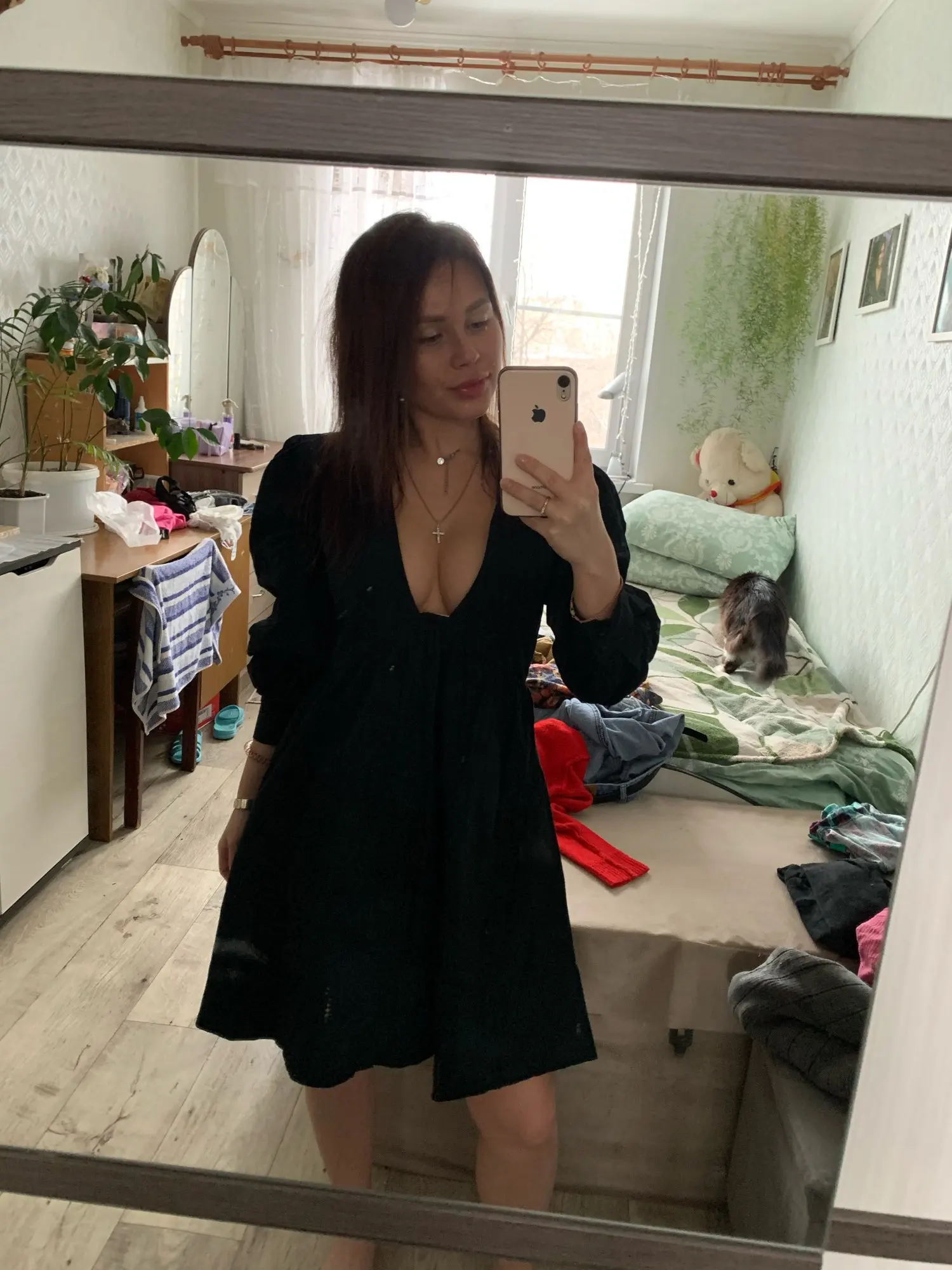 very decent dress. The material is pleasant, I will not approve it at the expense of naturalness. The growth of 178 is short, but not critical. Size L is the most suitable for dew 46. Sleeve 3/4, cuffs fastened on 2 buttons. On a small chest, a cup in maximum. Although the cutout and large, personally I'm comfortable, nothing falls out. Maybe I would like a more oversize fit, but this size is maximum, and it would not have been possible to wear a naked body. Black dress without lining, but it is not needed. I'm thinking about taking also white, because they are universal. I saw these dresses in Insta at the Atelier 13 and fell in love, I'm glad, what I found on SM at a pleasant price) the store put also a rubber band for hair as a gift, pleasant little thing) photo immediately after unpacking, the dress has not yet steamed.