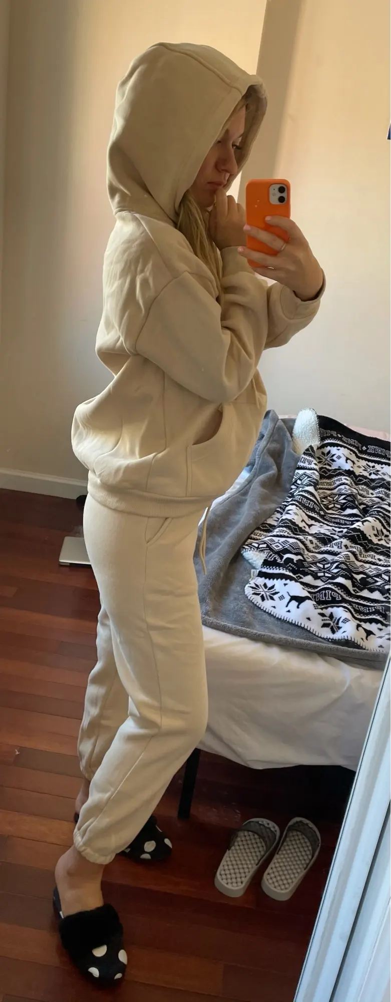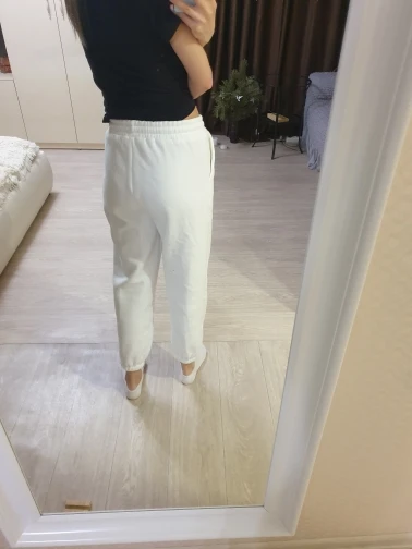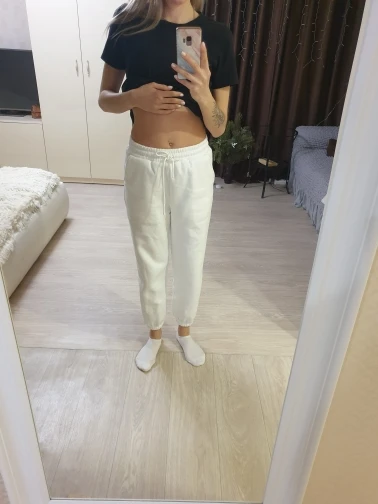 There was a parcel of 14 days in Samara. Got in five. Very convenient. Pants of beautiful snow-white color. Cloth is dense inside fleece. Despite the fact that they are dense black underwear translucent slightly. The fabric is pleasant, but every small garbage is clinging to itself. No smell. My height is 175. About 94. I ordered the size of M. Length to me just above the ankle. With sneakers the most it. I recommend to buy.