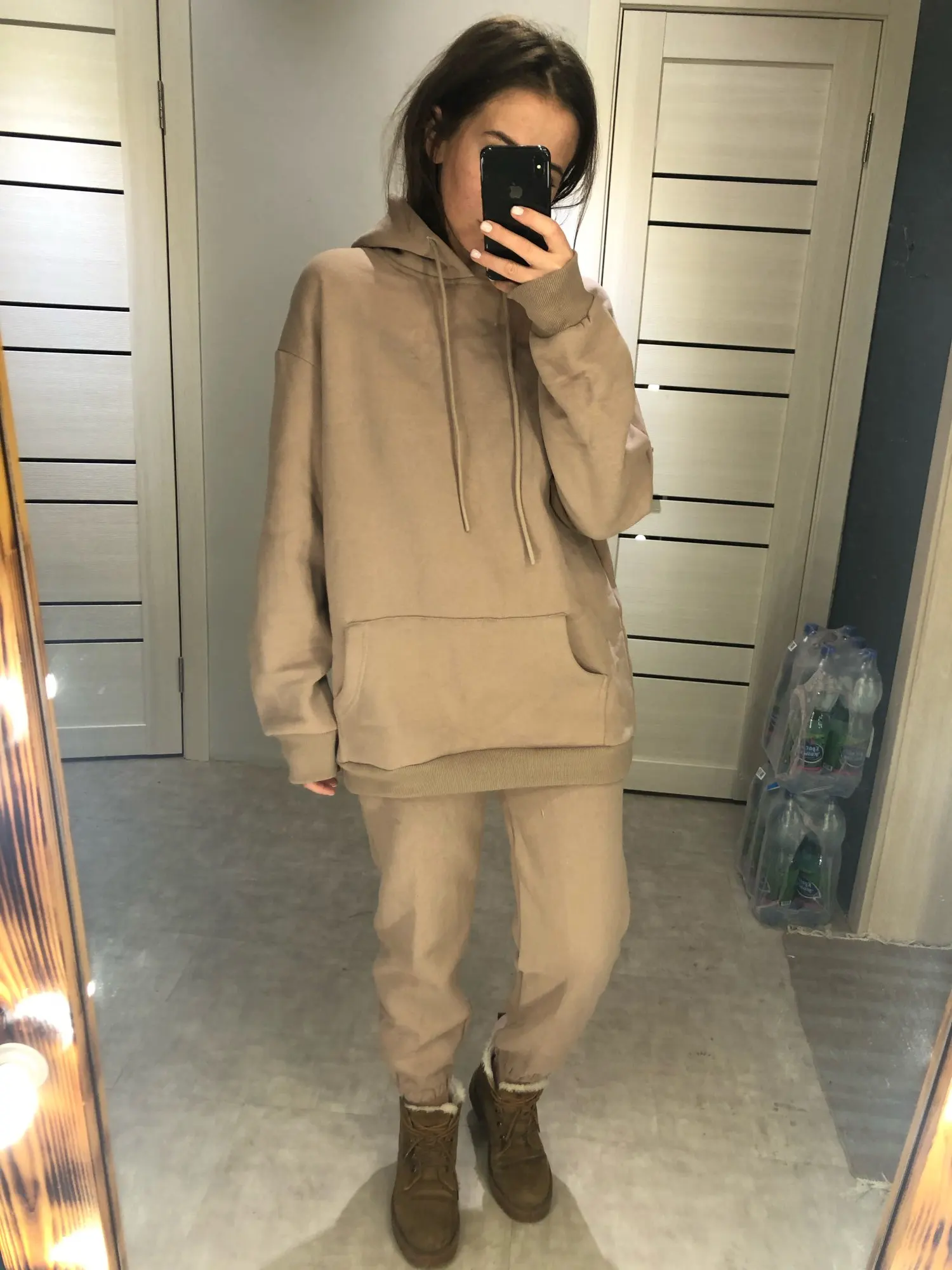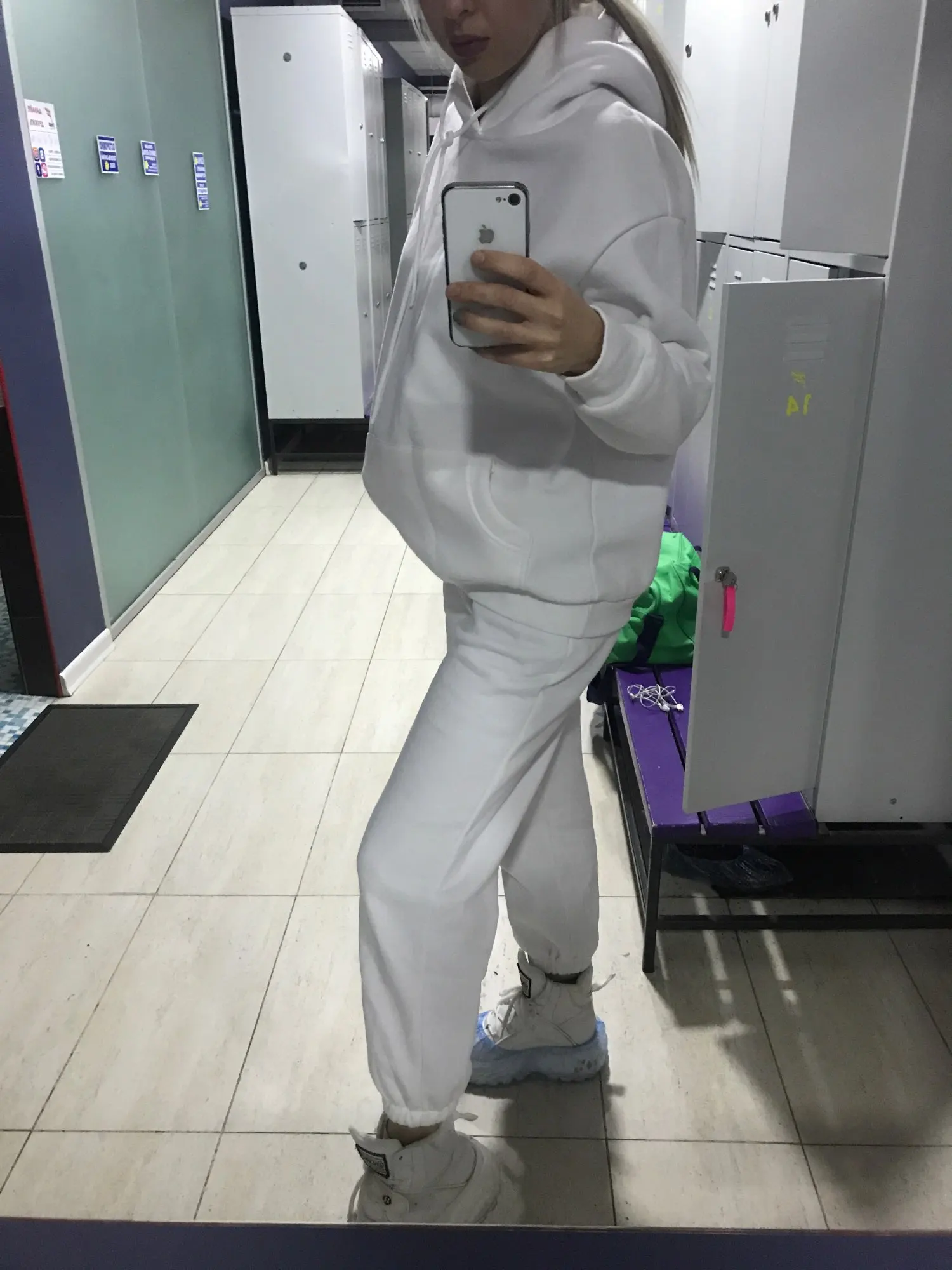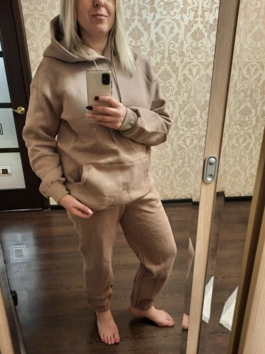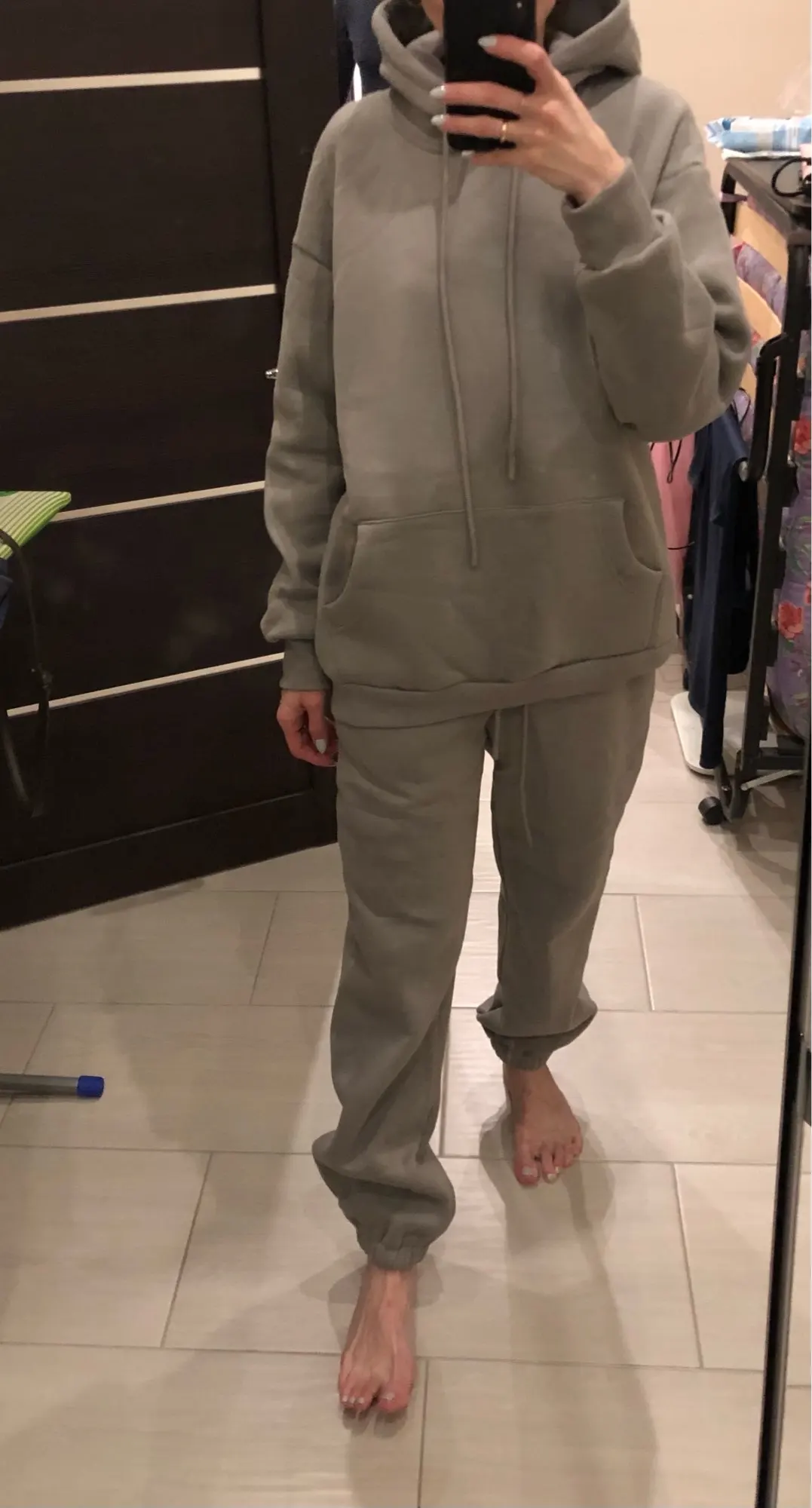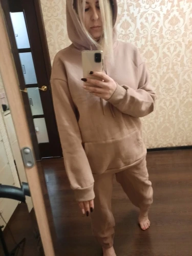 The order was 11.11, the parcel arrived at the 30.11 liaison office. The store umnichka sent the order in a couple of days, despite the whole purchase during the World sale. Quality gun! There is one drawback: See the photo, the threads are not removed on the elastic band. Lining-fleece, suit warm. Color as in the photo. The hood is big. The back of the hoodie is slightly longer. On my parameters 80-65-89 took the hoodie size S, pants size M (Took according to reviews), was afraid that there would be short. The photo shows that I have a good stock, the suit turned out to be an oversize. In general, I'm happy)) the seller put as a gift a cute desktop calendar)) very nice :) prosperity to your store!