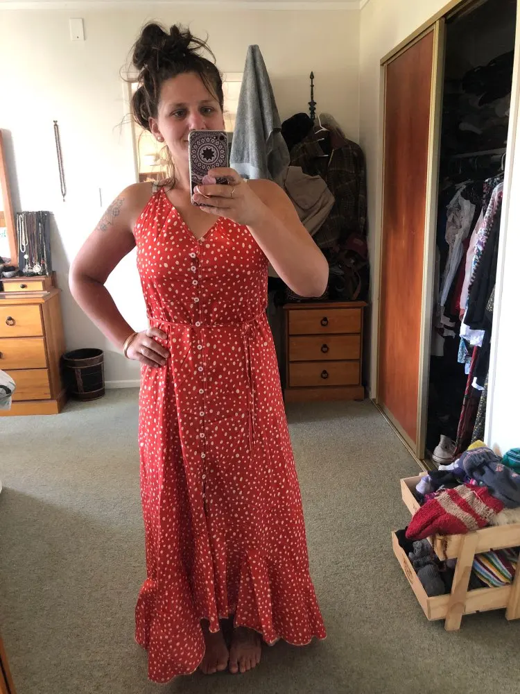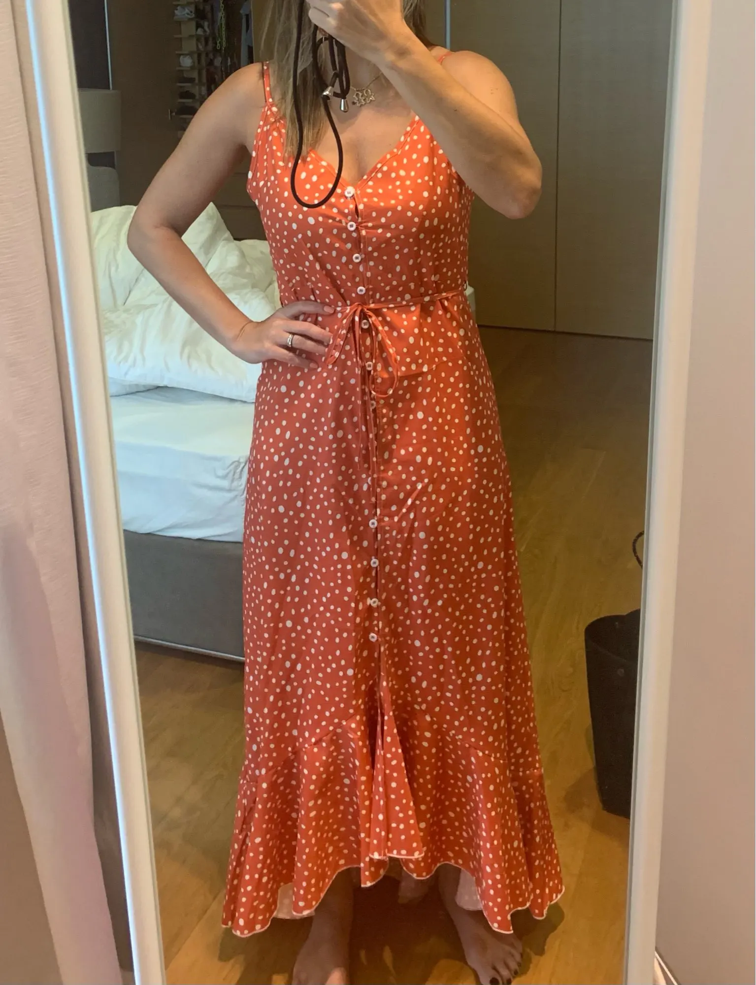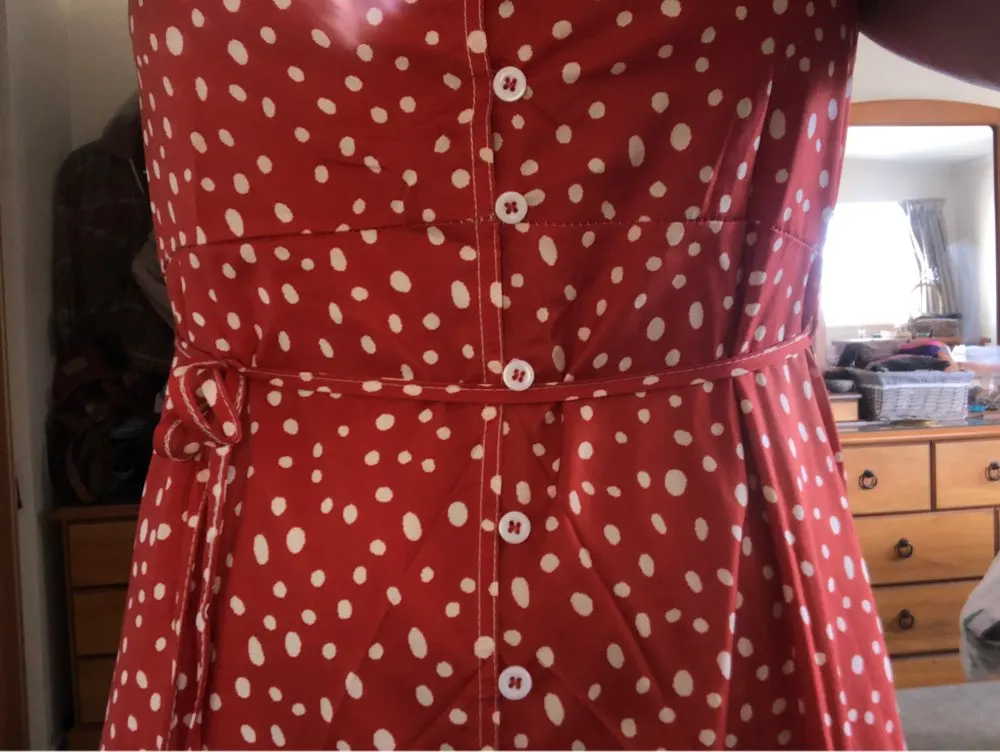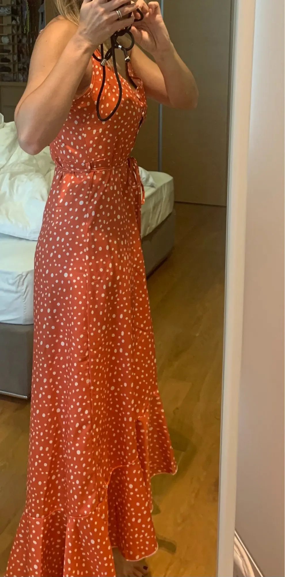 Beautiful dress, fits a little bigger than expected but still is good. I ordered a size L but could’ve gone with a medium. Overall very happy with this garment!! Super quick shipping!!