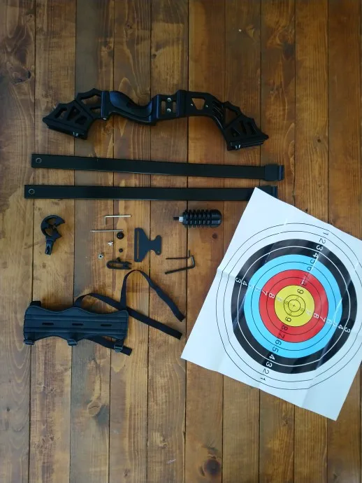Riser * 1 Limb *2 Sight x 1 Brush Arrow Rest x 1 BowString * 1 Spanner * 1 set Paper target * 1 Arm Guard*1 Shock absorber*1
