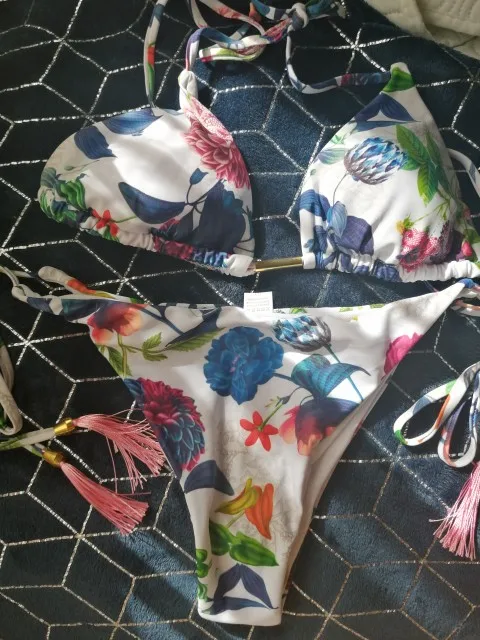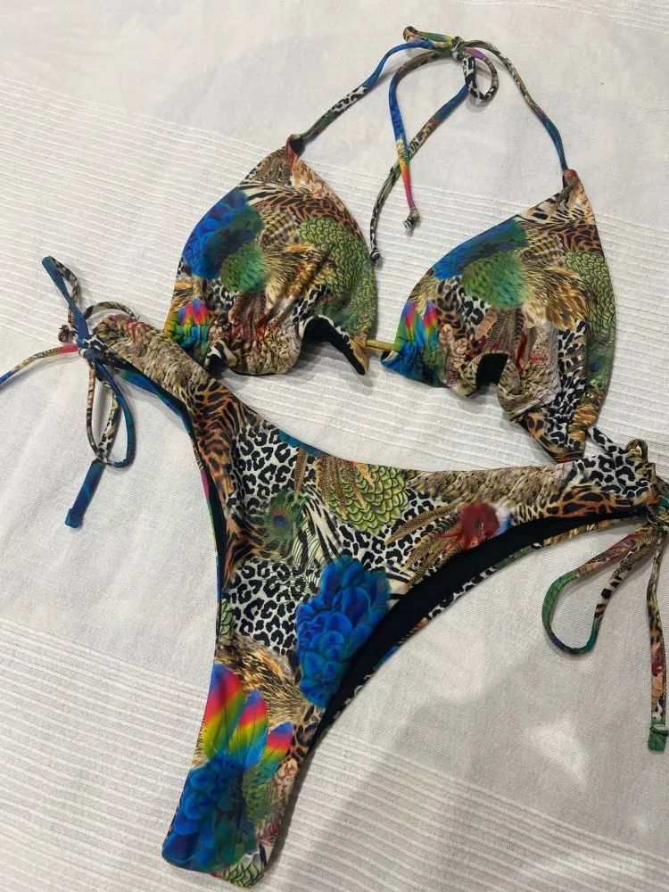 New Exquisite Bathing Suit For Women in 2021. Halter Neck Push up Padded Thong Bikini. Tropical Designs Super Comfy Bikini.