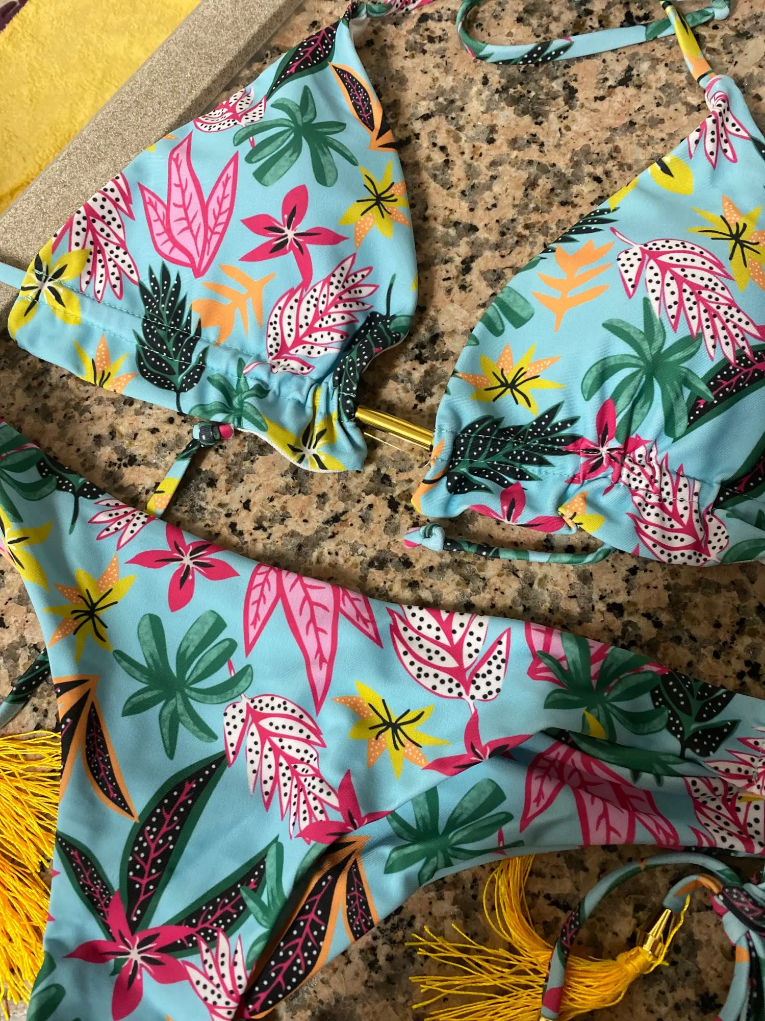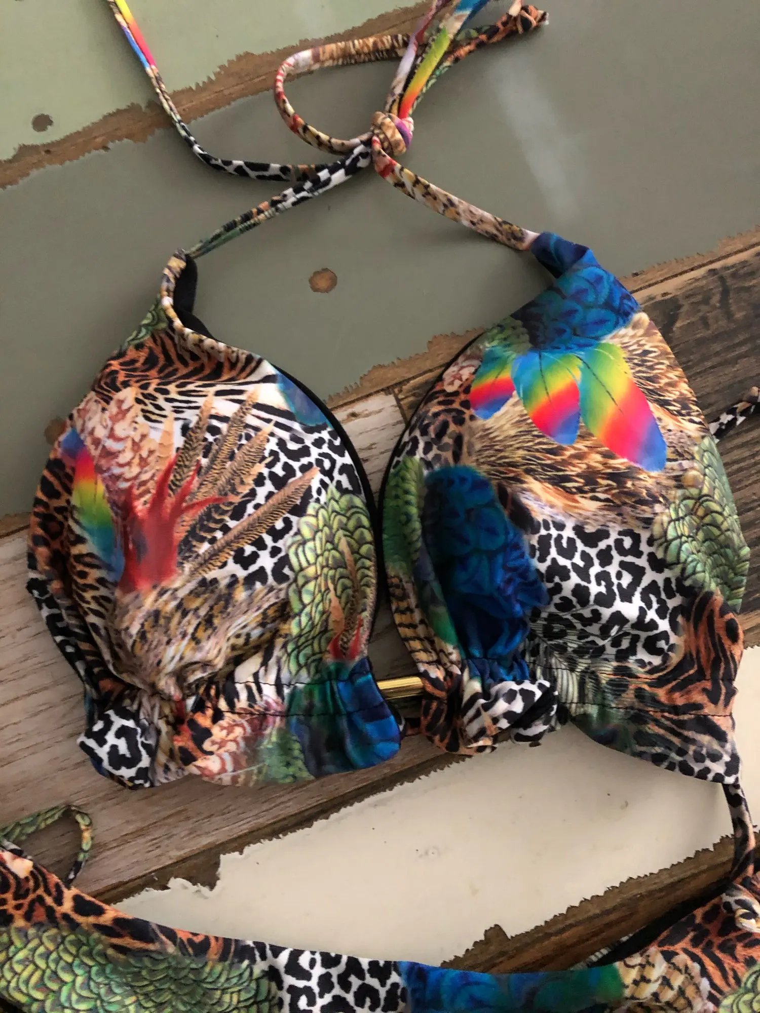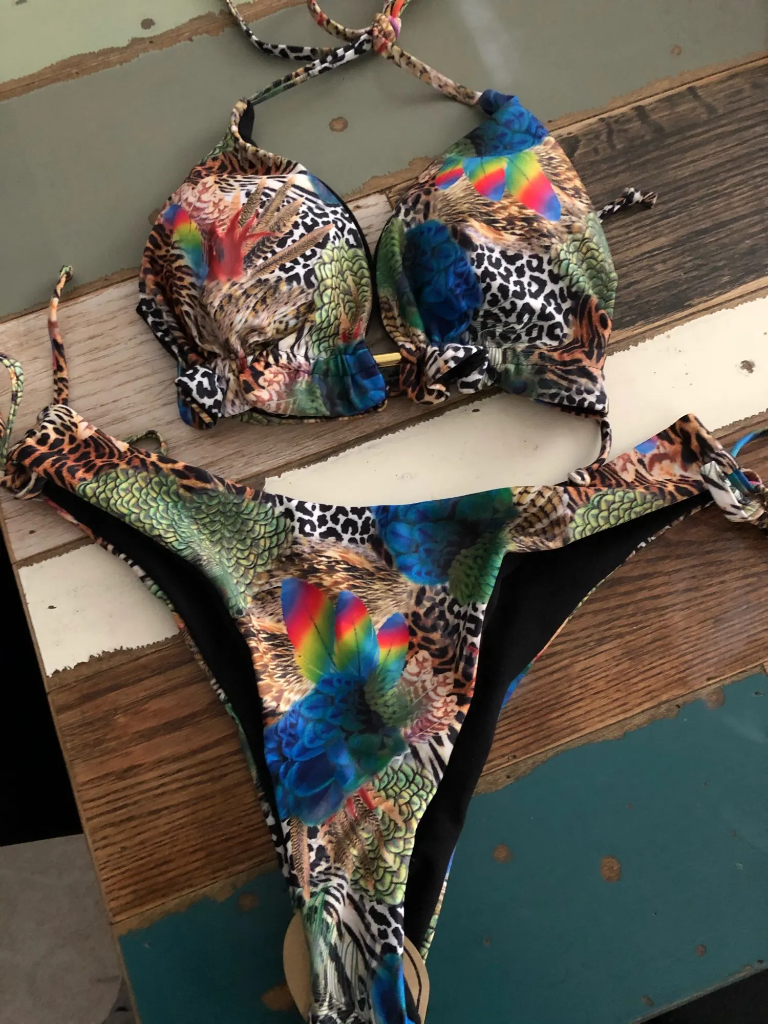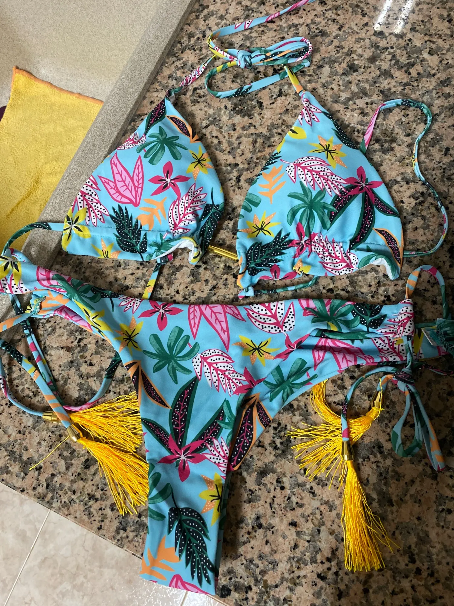New Exquisite Bathing Suit For Women in 2021. Halter Neck Push up Padded Thong Bikini. Tropical Designs Super Comfy Bikini.