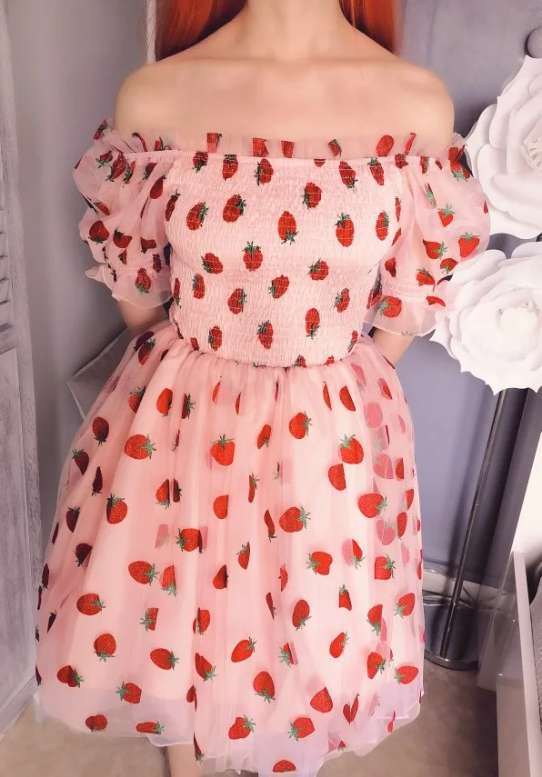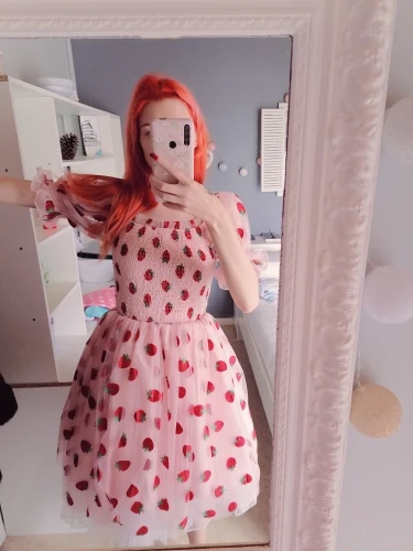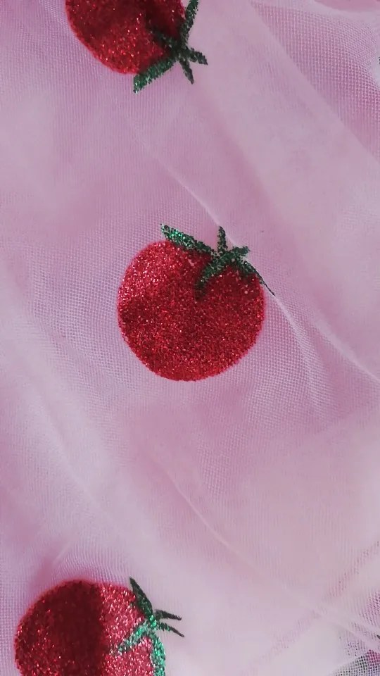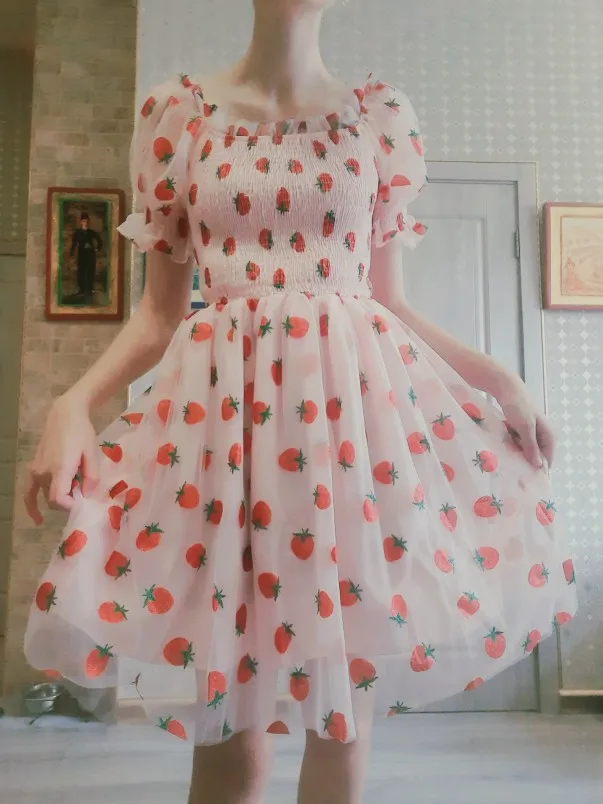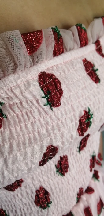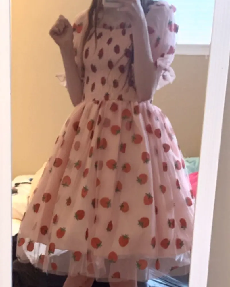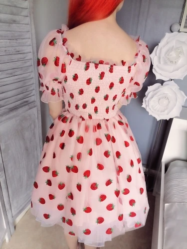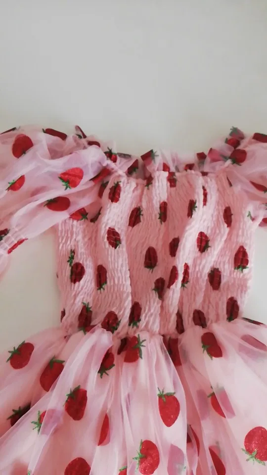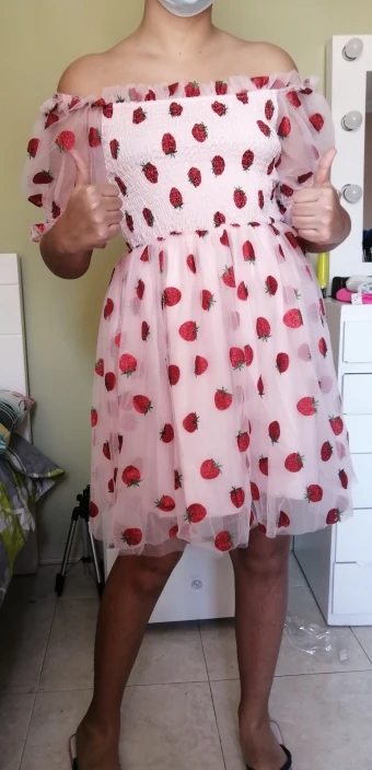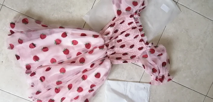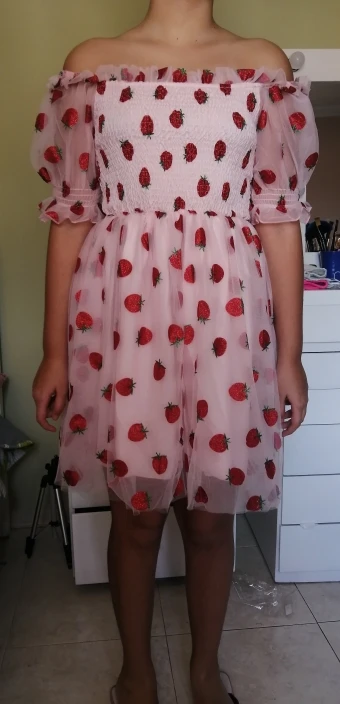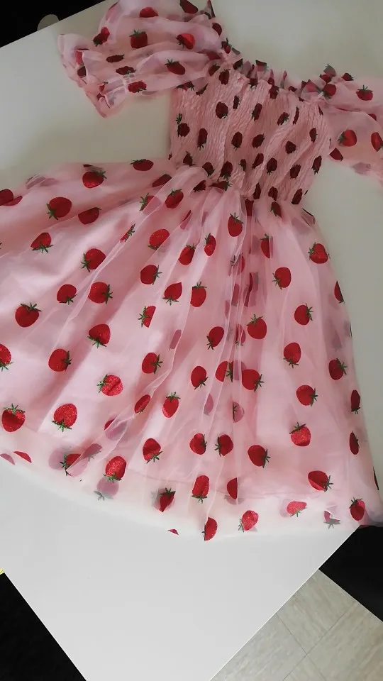 Simply beautiful dress. Strawberries have sequins that tend to leave but otherwise the dress is superb, with a very nice shape and it is identical to the photo. Arrived in a week or two
