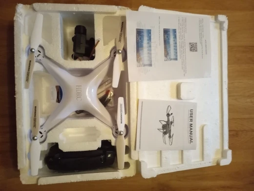 RC Drone Quadcopter with 4K HD Profesional Wide-Angle Aerial Photography Capable Camera. Long Life Remote Control Helicopter. Big Drone Product size: 42 * 34.5 * 15cm (protective ring) Battery capacity: 3.7V 3000mAh rechargeable battery Remote Battery: 4 * AA battery Charging time: 150 minutes Battery Lifetime: 25 minutes Remote control signal: 2.4 GHz Remote control distance: 200 meters Indicator light: 4 LED lights Highest image resolution: 4096 * 2160 Maximum video resolution: 1920 * 1080 Order contains: Battery * 1 Aeroplanes * 1 Remote control * 1 charging cable * 1 Screwdriver * 1 Instruction Manual * 1 Sheet * 2 Protection ring * 4 Function:Up / Down, forward / backward, left / right turn / left / right fly / high hover / 360 degree flip, headless mode / one-button return, speed adjustment / phone operation / voice / flight operation Track / video camera / emergency stop / electric adjustment camera