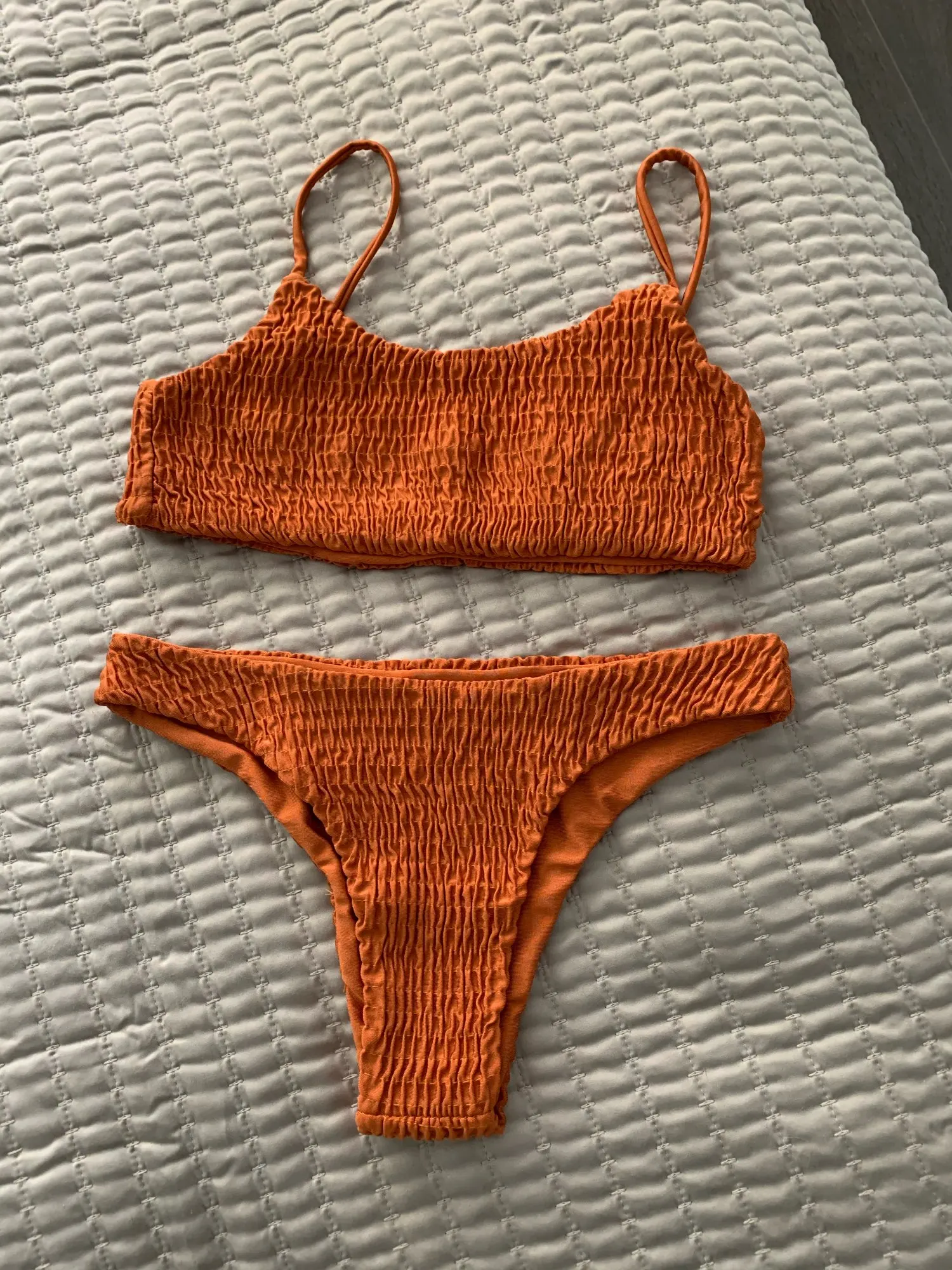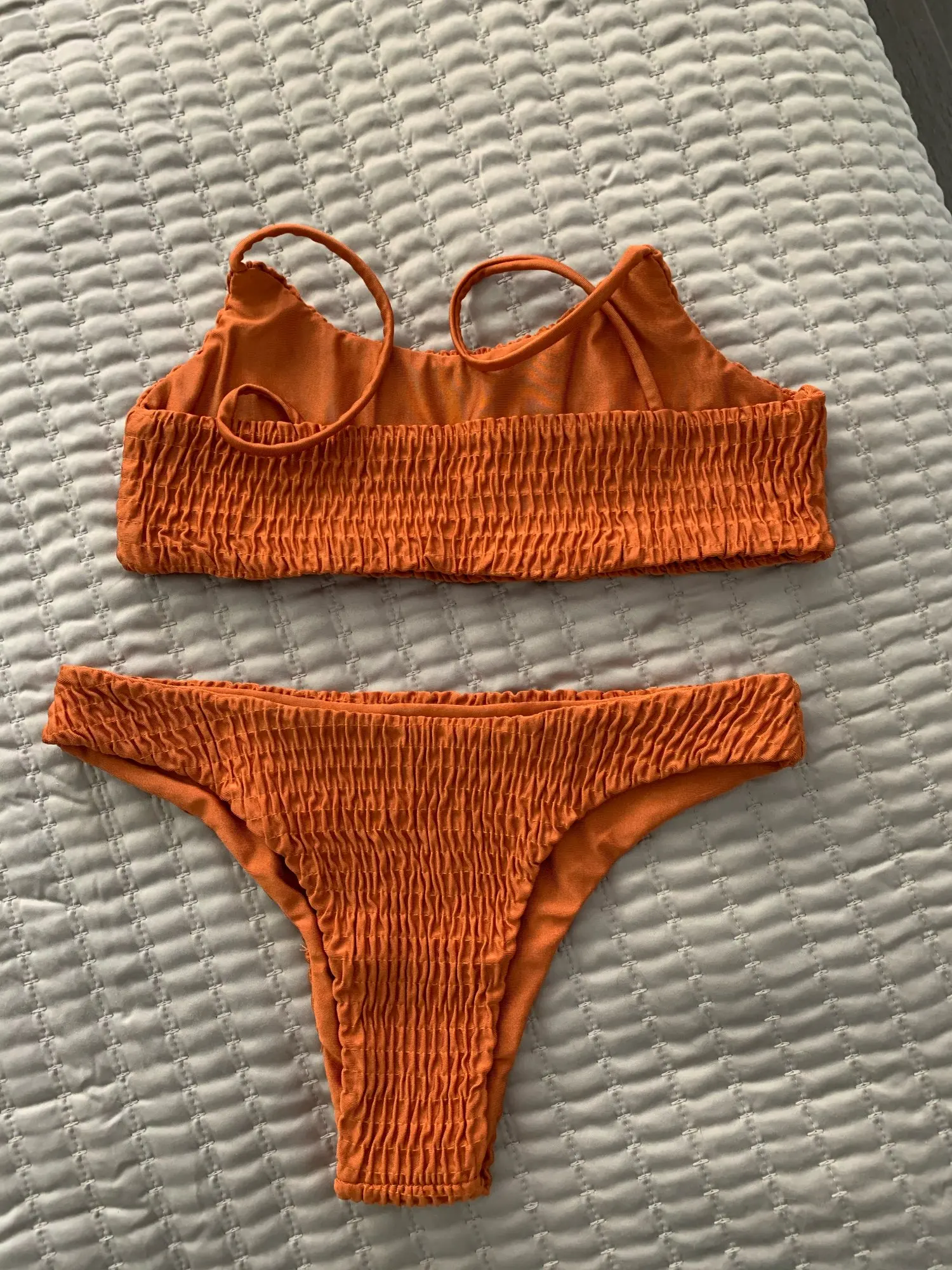 This swimsuit was perfect! I ordered the green one in size small. It came in two weeks exactly. It was true to size. The bottoms aren’t too cheeky, and the top fits very well. The color is accurate and looks so good on my skin! Super comfy and can’t wait to wear in summertime. Only concerns might be that there is no padding (I have a smaller chest so it’s fine for me) and the top might ride up a little if you’re super active while wearing (such as going to a waterpark or tubing on a lake). Otherwise, I would highly suggest this swimsuit. I am definitely looking to buy it in different colors :)