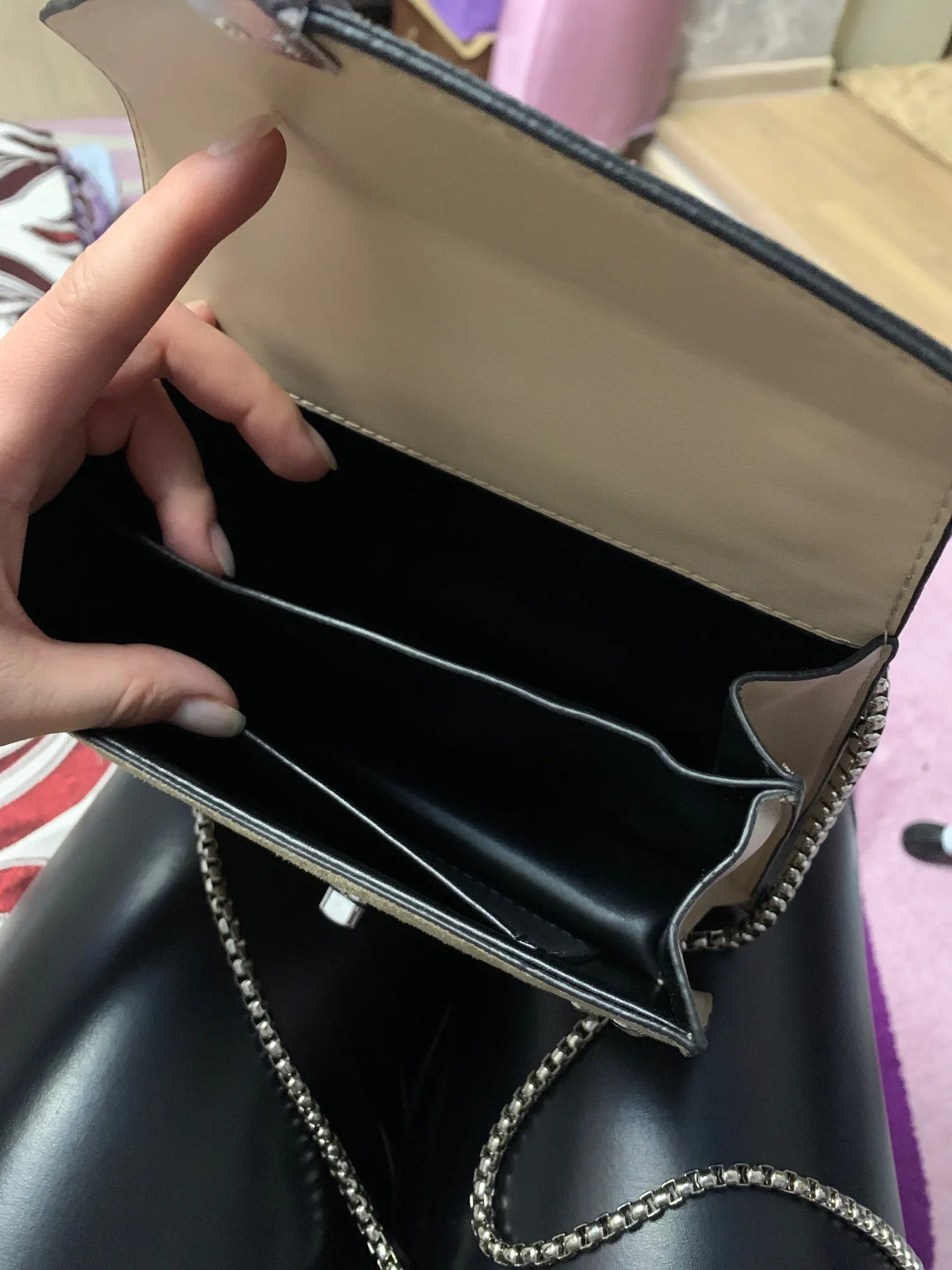 Ordered 12.11 (processed and sent the order 14.11), delivered to the Mail 14.12 in Orel. What else to write about the bag? here and so many positive reviews)))... it's just a bomb, especially for my 900R (I took for this amount). With my height of 172 cm over my shoulder of course I will not wear, because. Highly rises, well, and so simply super! Minuses did not find, at least so far))) there is no smell, the lock is good, chain-color, metal weight is good, clothes and hair does not cling. It was a little clogged, but it was already straightened up. I recommend the store!!! Thank you for your handbag!